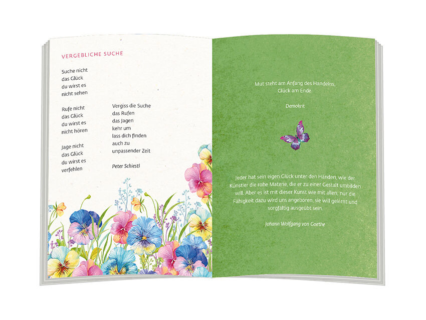 Glück ist kein Ziel. Glück ist eine Art zu leben. Es mitten im Leben nicht nur zu suchen, sondern auch zu finden, dazu inspirieren die hier zusammengestellten Wünsche und guten Gedanken. Mit Texten von Pablo Picasso, Isabella Schneider, Cornelia Elke Schray u....