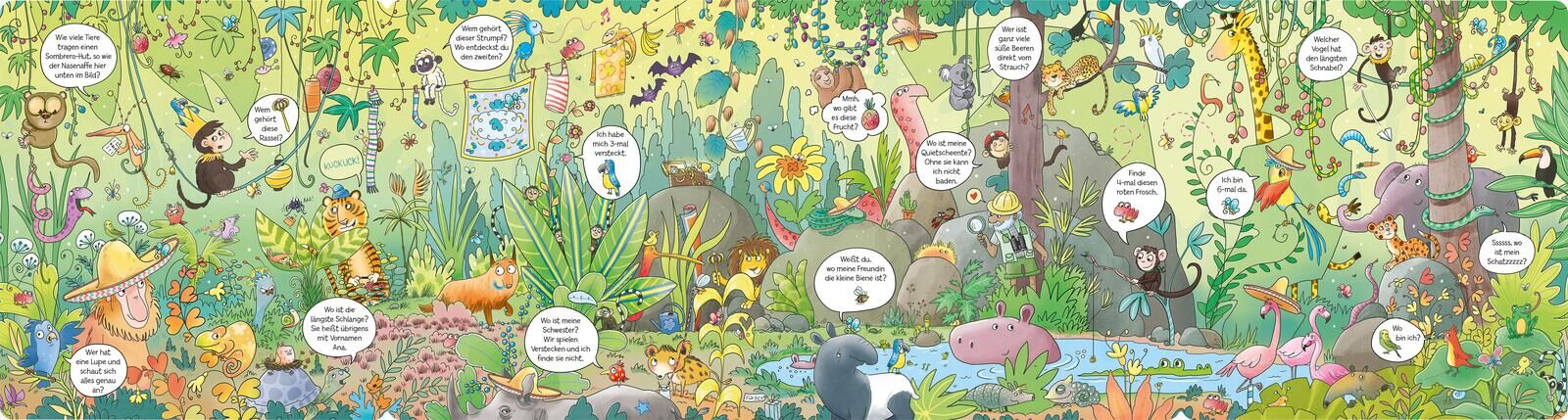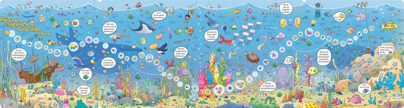 Unendlicher Spiel- und Suchspaß für Kinder ab 4 Jahren! Wo ist das Seepferdchen mit Rucksack? Wer pupst gerade? Welcher Vulkan spuckt die meisten Blasen aus? Über 100 lustige Suchaufgaben finden sich auf den 90 cm breiten Panoramaseiten , die von der wimmelig...