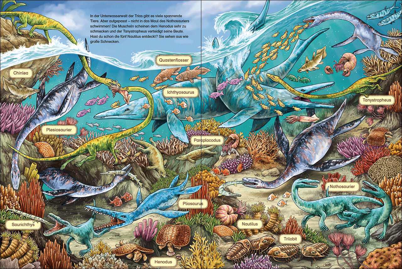 Atemberaubende Wimmelbilder zeigen unzählige Dinosaurier aus Trias, Jura und Kreidezeit in ihren faszinierenden Lebensräumen. Beobachte die Urzeitgiganten bei ihren Kämpfen und wie sie ihre Jungen verteidigen. Hier dürfen nicht nur kleine Dinoexpertinnen stun...