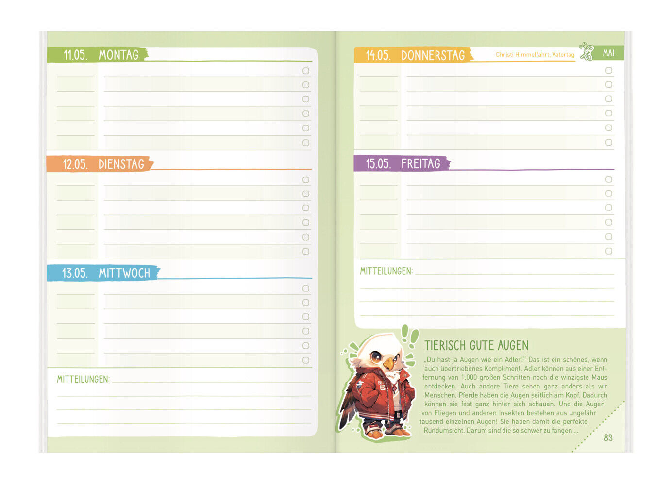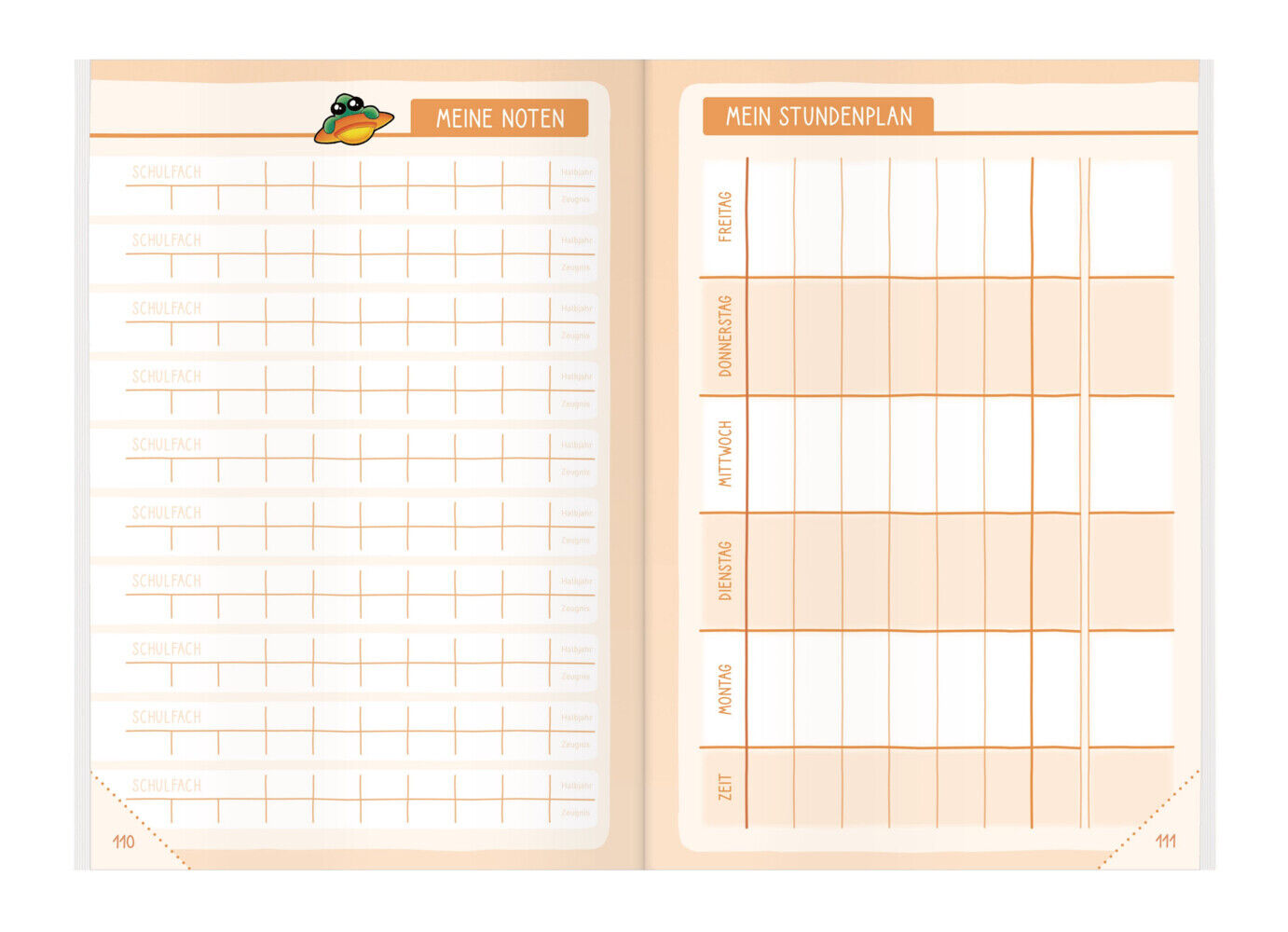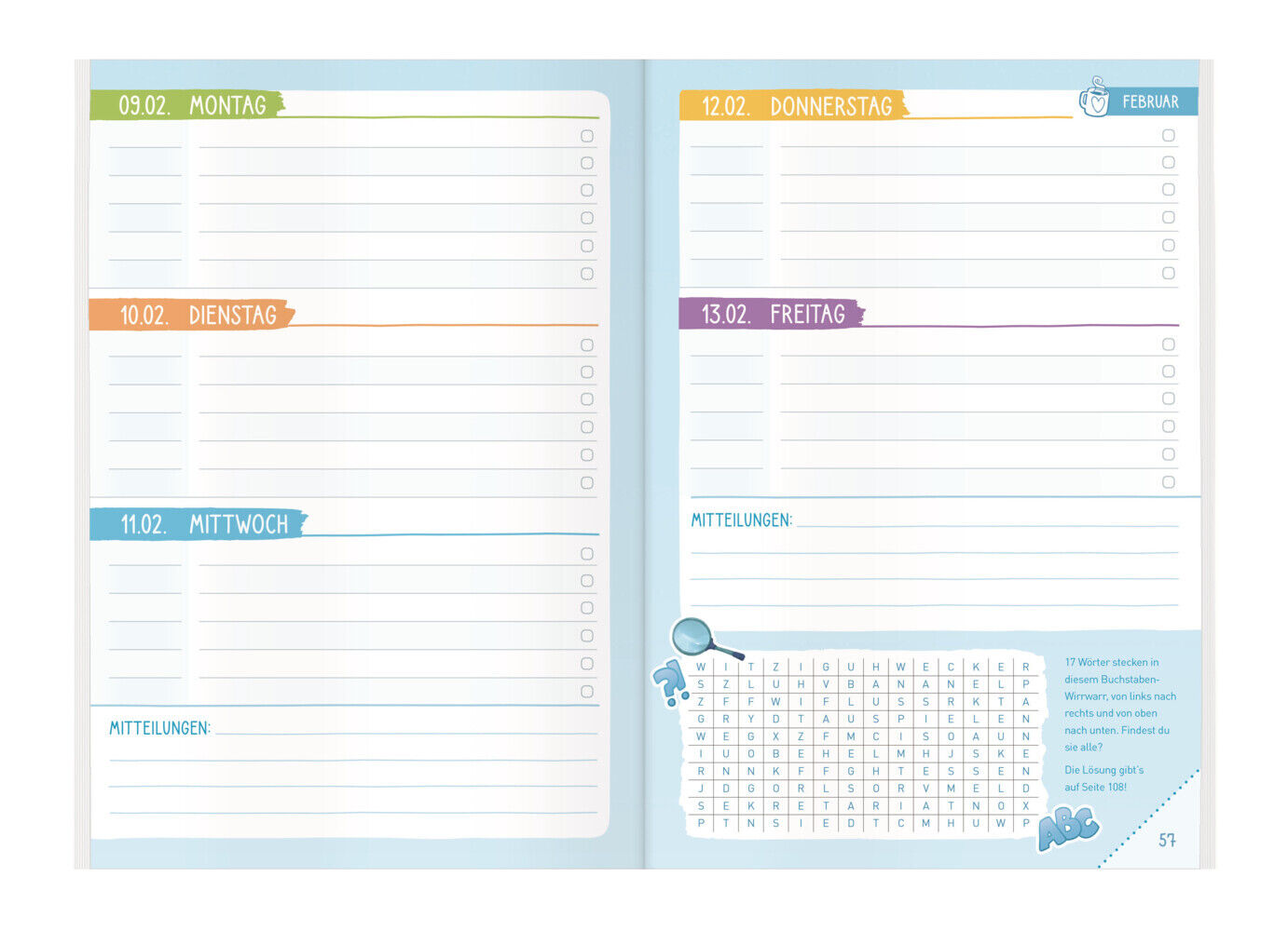 Hausaufgabenheft für das Schuljahr 25/26, 112 Seiten, Format A5, mit Lerntipps, Spielen und Wissenshäppchen, jeder Wochentag hat seine eigene Farbe, praktische große Felder für Einträge von Eltern, Lehrern und Hort, Stickerbogen, Einzelmotiv