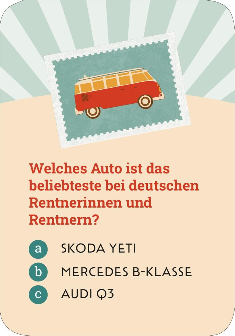 50 Fragen aus Musik, Kultur, Gesellschaft: unterhaltsamer Rätselspaß für die Rente Diese Quizbox lässt im Ruhestand garantiert keine Langeweile aufkommen! Das kurzweilige Wissensspiel mit 50 Quizfragen ist ein ideales Mitbringsel zum Rentenbeginn. Fragen rund...