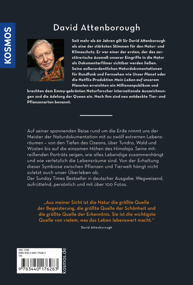 Der legendäre Tierfilmer und Naturforscher Sir David Attenborough porträtiert in seiner unnachahmlichen Art die Lebensräume auf unserem Planeten. Er erklärt, wie alles Lebendige zusammenhängt und wie verletzlich dadurch die Erde wird, durch Klimawandel, Umwelt...