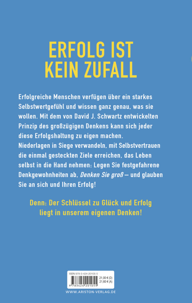 Der Longseller jetzt als Sonderausgabe Erfolgreiche Menschen verfügen über ein starkes Selbstwertgefühl und wissen ganz genau, was sie wollen. Mit dem von David J. Schwartz entwickelten Prinzip des großzügigen Denkens kann jeder sich diese Erfolgshaltung zu ei...