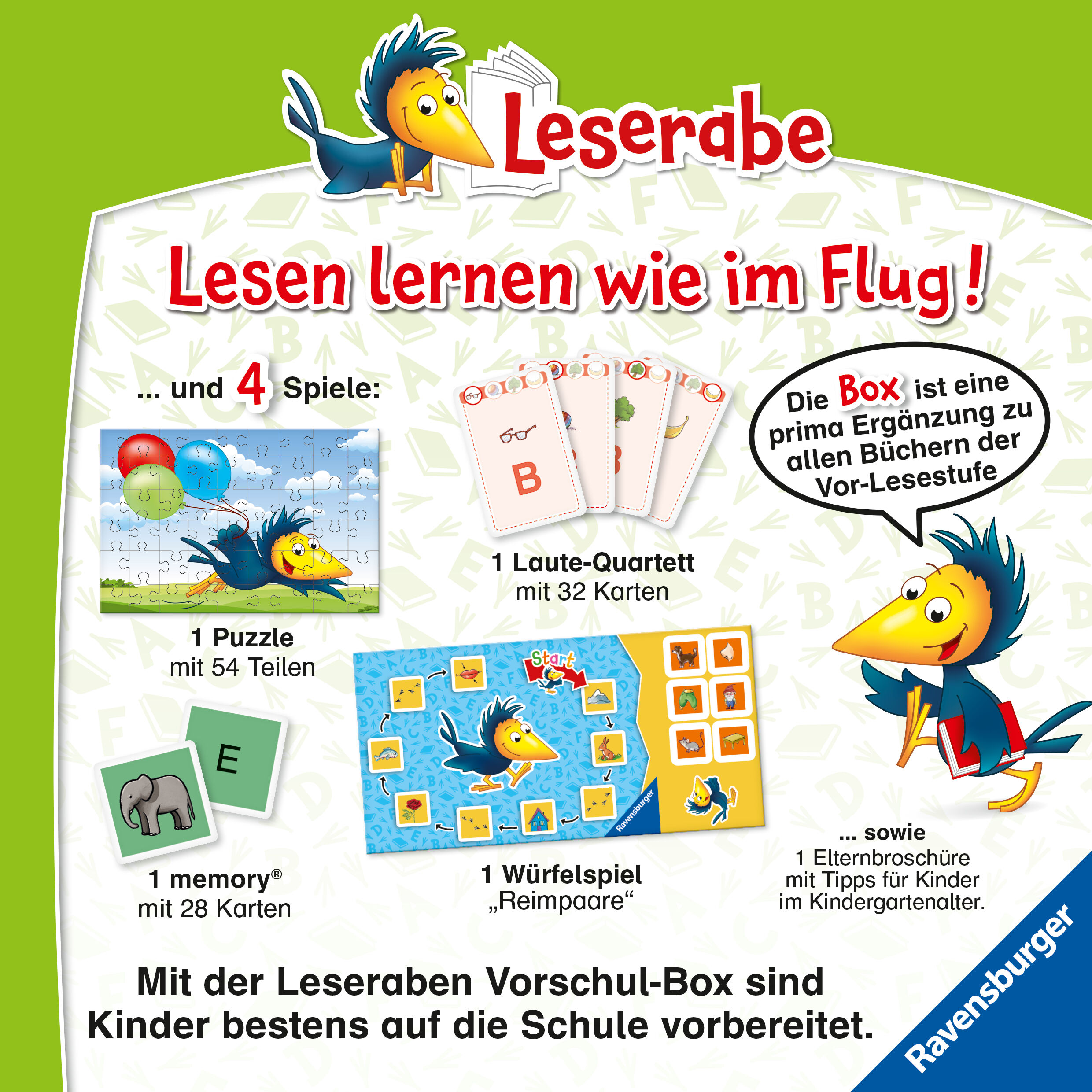 Lesen lernen wie im Flug! Lesenlernen fängt schon im Kindergartenalter an! Gemeinsam mit dem Leseraben entdecken Vorschulkinder Anlaute, Reime und erste Buchstaben. Spielerisch entwickeln sie so ein Verständnis für den Zusammenhang zwischen Anlauten und Schrif...