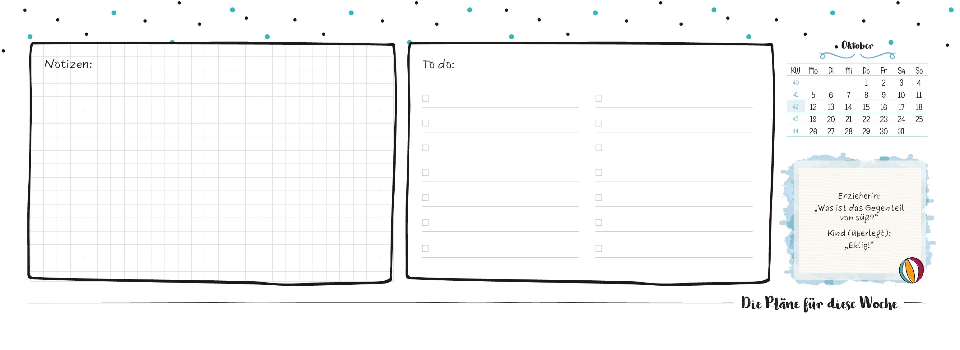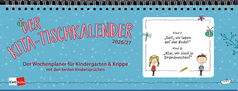 Kinderleicht das Kita-Jahr 2026/2027 organisieren und planen! Unser Kita-Tischkalender ist mehr als nur ein Planer er ist Ihr täglicher Begleiter im Kindergarten oder in der Krippe. Die lustigen Kindersprüche zaubern Ihnen und Ihren Kolleg:innen ein Lächeln i...