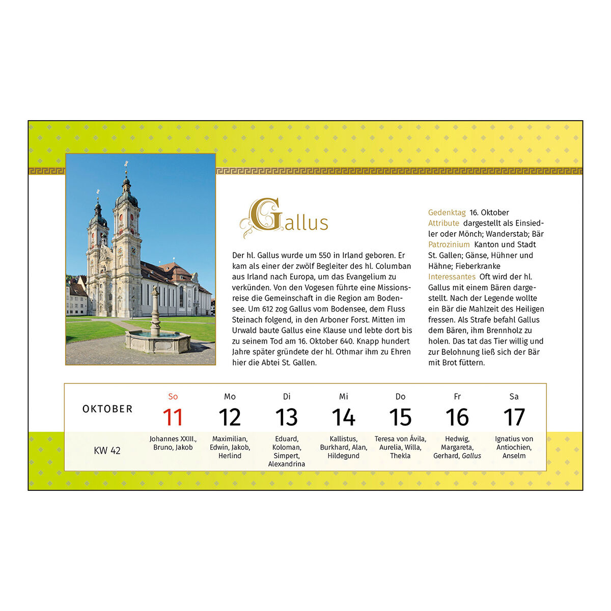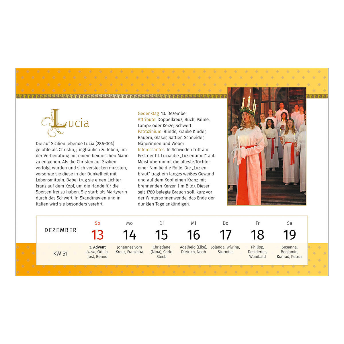 Dieser innovative Wochenkalender versammelt über 50 unterhaltsame Heiligenporträts sowie Hinweise auf weitere 200 Tagesheilige. Zudem finden Sie zu den jeweiligen Heiligen der Woche Angaben zu Patrozinien, Attributen und es wurde eine Bildauswahl getroffen, di...
