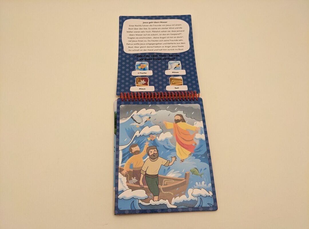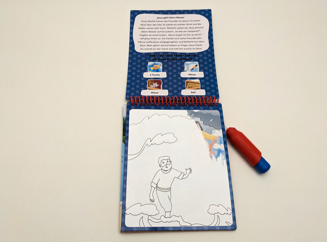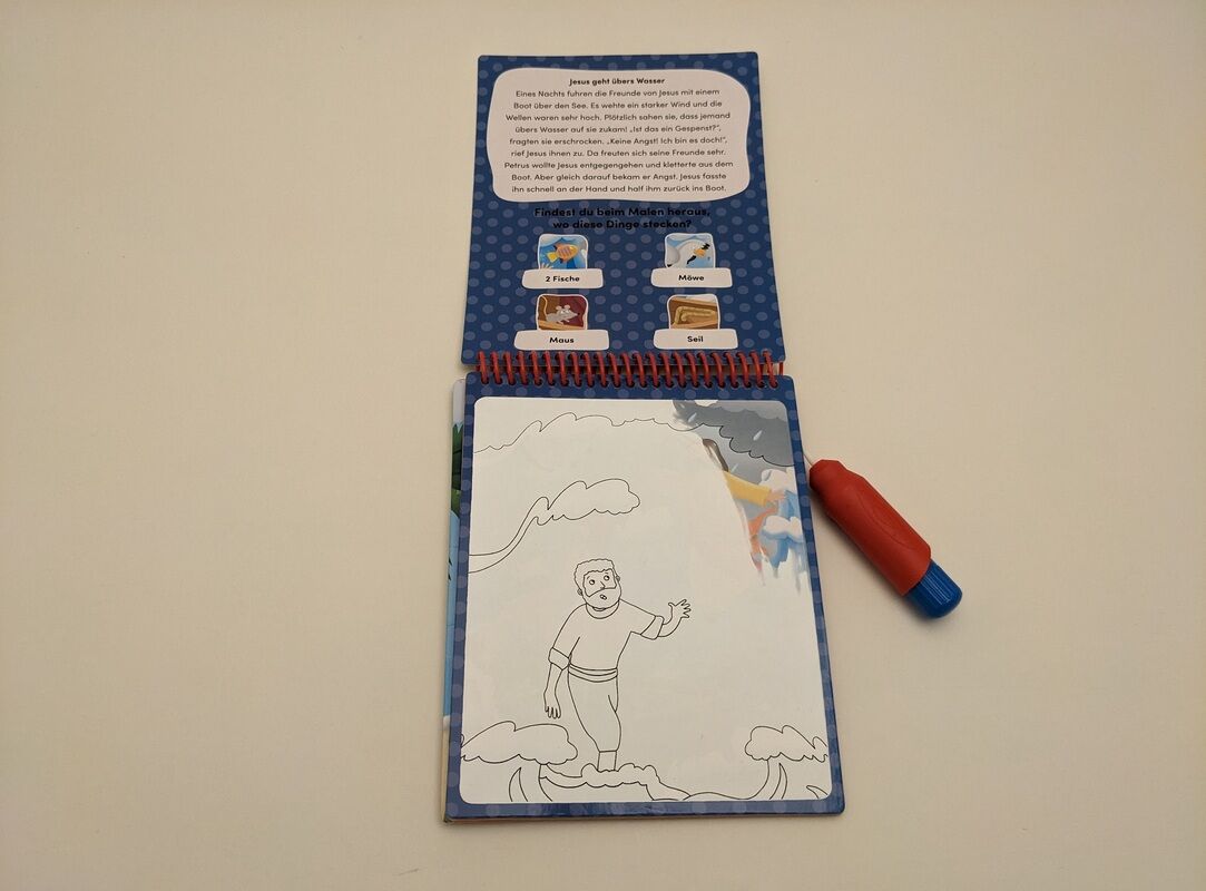 Mit diesem außergewöhnlichen Malbuch können schon die Kleinsten auf spielerische Weise etwas über die Wunder erfahren, die Jesus getan hat: Wenn man mit dem beiliegenden Pinsel über die weißen Flächen fährt, werden die farbigen Illustrationen sichtbar.