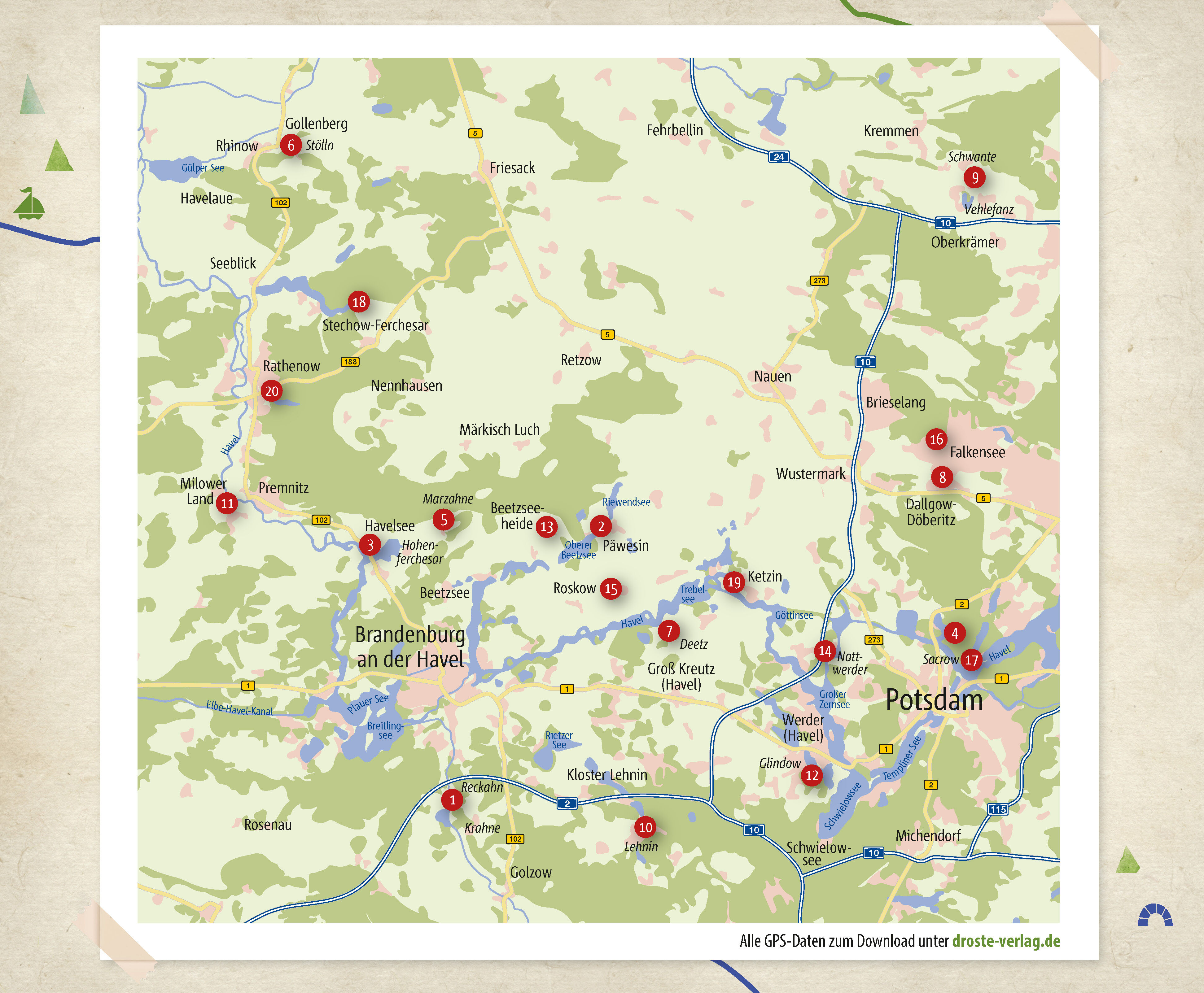 Wie ein blau-grünes Mosaik liegen im Havelland verschiedenste Landschaften nah beieinander: malerische Niederungen und sandige Höhen, verträumte Flussauen und glitzernde Seen. Auf stillen Wegen streift man durch die Döberitzer Heide, erklimmt die Glindower Alp...