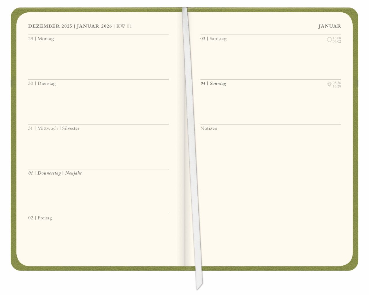 Zeitlos, minimalistisch und elegant: Schlichter Timer in Grün aus der Serie Diario - Buchkalender im A6-Format für den komfortablen Überblick: mit praktischem Kalendarium und viel Platz für Termine und Eintragungen - Neutrales Design in edler Ausstattung: Pl...
