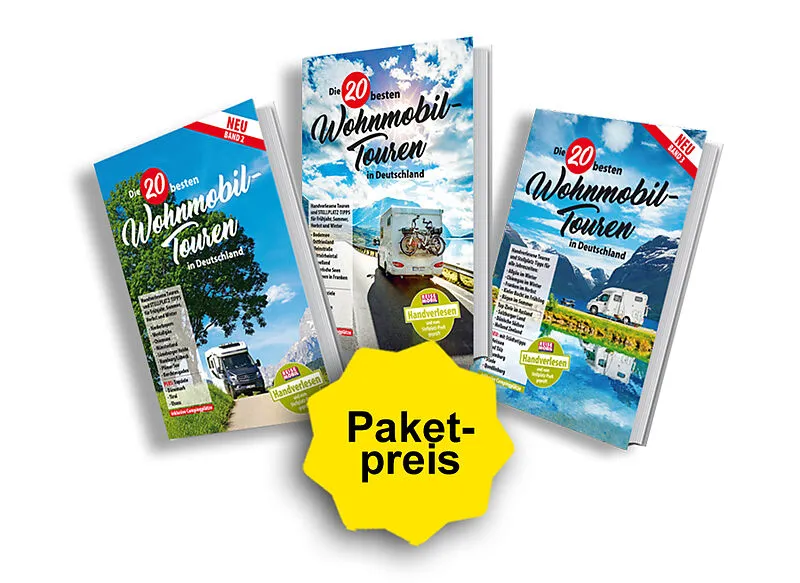 Bei gleichzeitigem Kauf der beliebten drei Bücher "Die 20 besten Wohnmobiltouren in Deutschland Band 1" (978-3-928803-80-9), "Die 20 besten Wohnmobiltouren in Deutschland Band 2" (978-3-928803-82-3) und "Die 20 besten Wohnmobiltouren in Deutschland Band 3" (97...