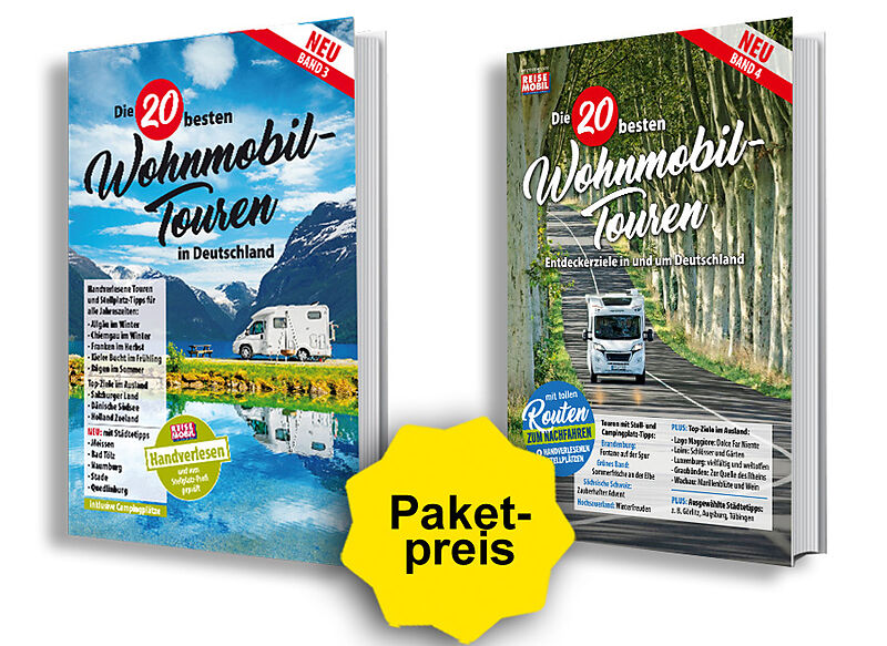 Bei gleichzeitigem Kauf der beliebten zwei Bücher "Die 20 besten Wohnmobiltouren in Deutschland Band 3" (978-3-928803-86-1) und "Die 20 besten Wohnmobiltouren - Band 4, Entdeckerziele in und um Deutschland" (978-3-928803-93-9) gibt es ab sofort einen günstigen...