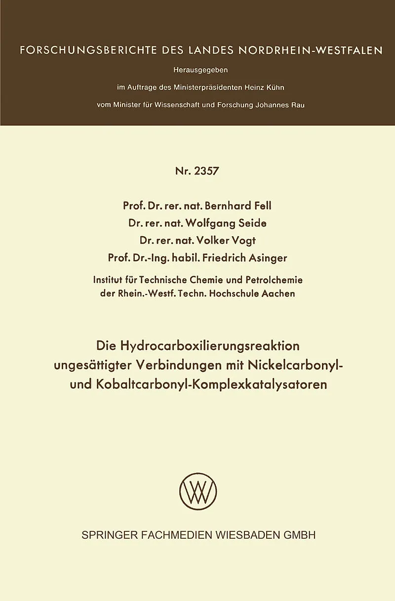 Inhalt 1.0.0. Einleitung und Aufgabe.- 2.0.0. Die Nickelcarbonyl-katalysierte Hydrocarboxylierung der Olefine.- 3.0.0. Die Nickelcarbonyl-katalysierte Hydrocarboxylierung höhermolekularer n-Alkine.- 4.0.0. Die Hydrocarboxylierung höhermolekularer primärer und ...