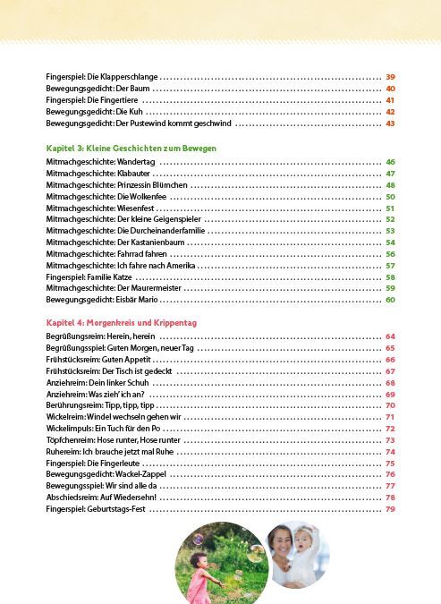 Ein Krippentag ohne Fingerspiele und Bewegungsreime? Undenkbar! Dieses Buch ist ein wahrer Schatz an neuen fantasievollen Geschichten, die die Kinder mit ihren Händen zum Leben erwecken können: Unterwegs mit Familie Katze, ein herbstlicher Ausflug zum Kastanie...