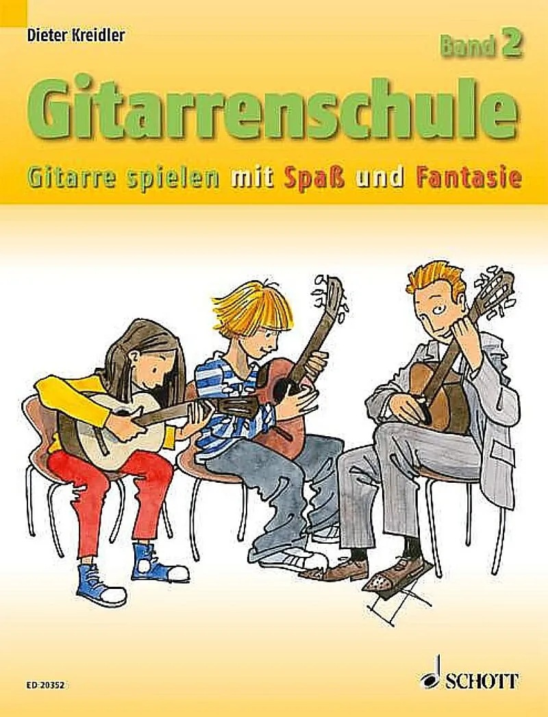 Dieter Kreidler's new guitar method is aimed primarily at children and young people who want to learn to play the guitar in small steps. It contains numerous ensemble pieces and varied exercises for song accompaniment and is suited for both private and group l...Dieter Kreidler's new guitar method is aimed primarily at children and young people who want to learn to play the guitar in small steps. It contains numerous ensemble pieces and varied exercises for song accompaniment and is suited for both private and group lessons. Right from the beginning, the first experiences of ensemble playing are gained with the group. The method intentionally moves forward in small steps. The exercises and instrumental pieces of various styles are arranged in a progressive order and framed by inspiring illustrations, riddles, info boxes and creative exercises which stimulate the imagination and make the lessons a lot of fun. Volume 2 deepens the topics addressed in Volume 1 and introduces two-part playing with open bass strings as well as the change of position. Besetzung: Gitarre