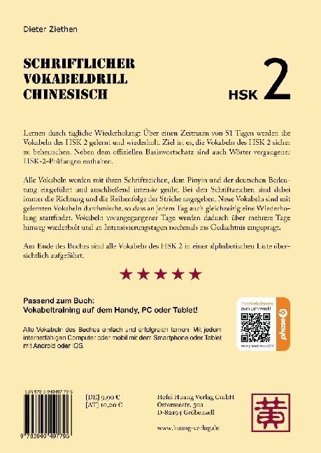 Lernen durch tägliche Wiederholung: Über einen Zeitraum von 51 Tagen werden die Vokabeln des HSK 2 gelernt und wiederholt. Neue Vokabeln werden mit Schreibung der Schriftzeichen und der Aussprache in Pinyin eingeführt und anschließend intensiv geübt. Intensivi...