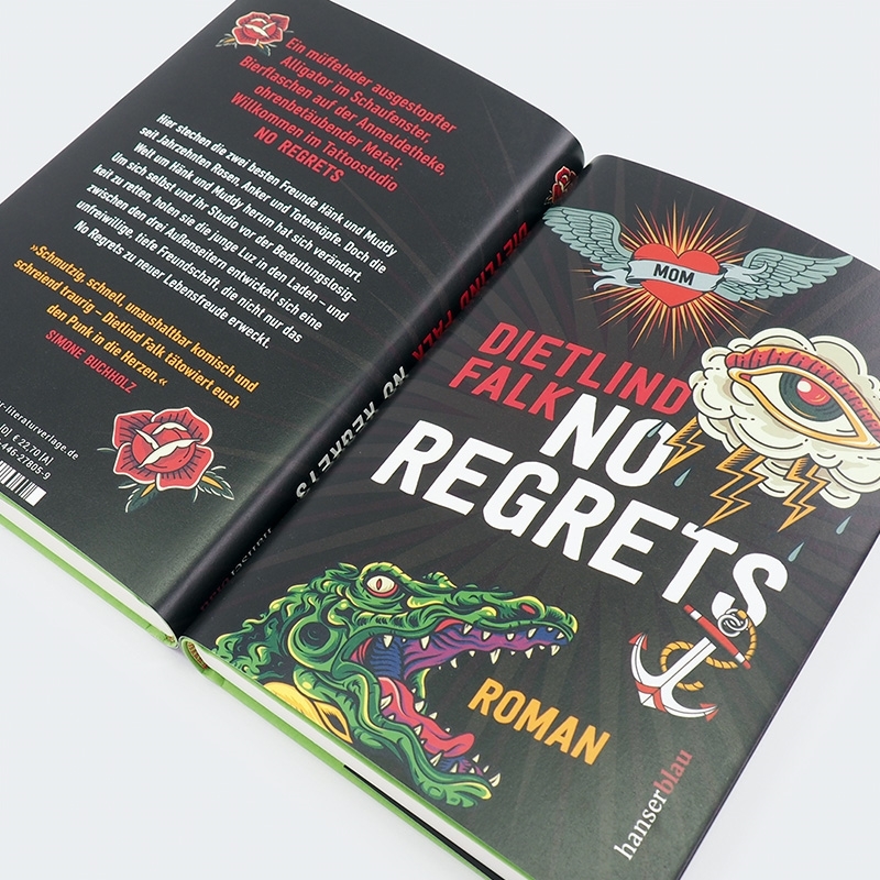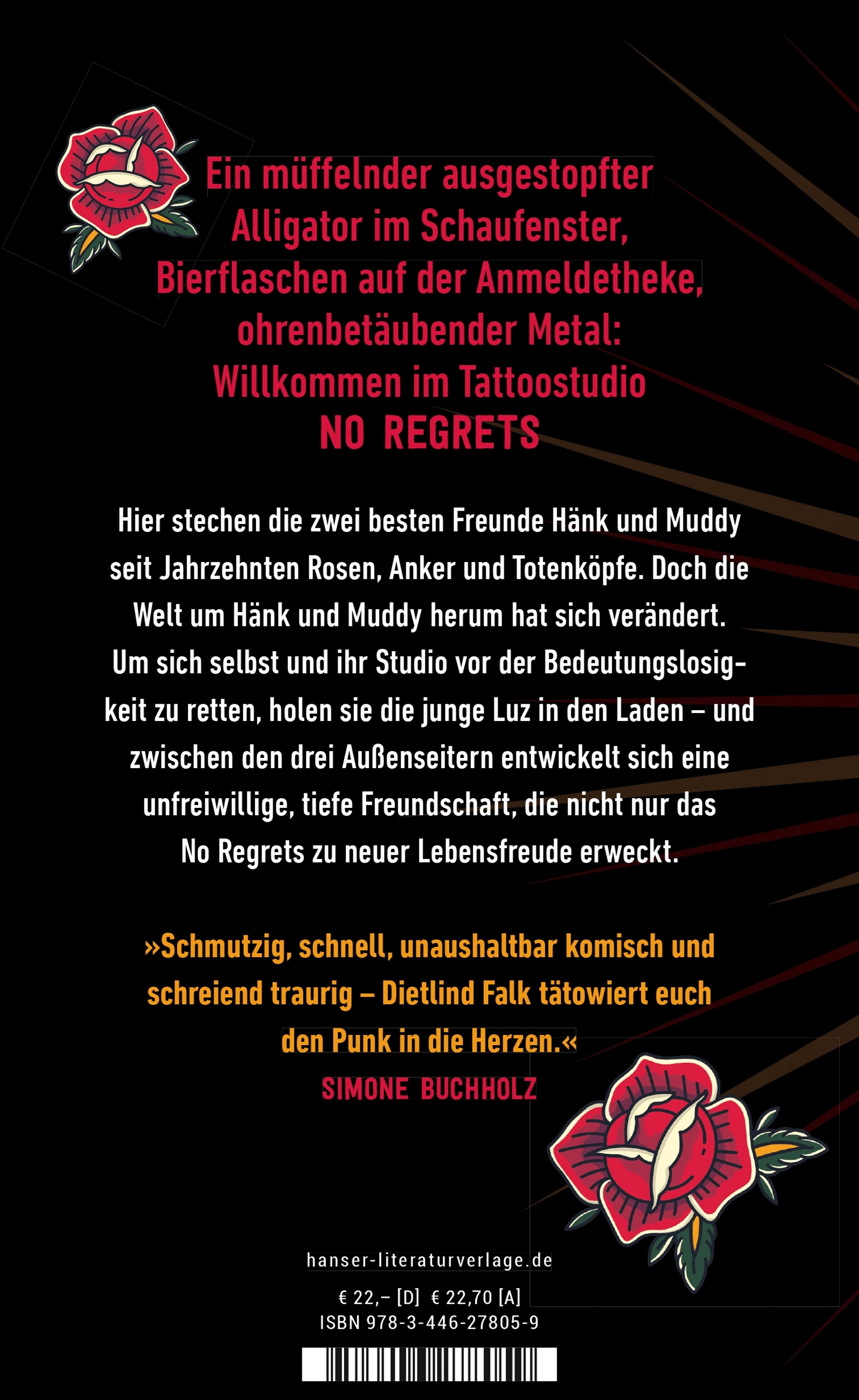 Ein hinreißender Roman über Freundschaft und Freiheit und darüber, wie man beides wiederfindet, wenn es einem abhandengekommen ist. Das ist schmutzig, schnell, unaushaltbar komisch und schreiend traurig, einfach richtig gut kaputt Dietlind Falk tätowiert euch ...Ein hinreißender Roman über Freundschaft und Freiheit und darüber, wie man beides wiederfindet, wenn es einem abhandengekommen ist. Das ist schmutzig, schnell, unaushaltbar komisch und schreiend traurig, einfach richtig gut kaputt Dietlind Falk tätowiert euch den Punk in die Herzen." Simone Buchholz Ein müffelnder ausgestopfter Alligator im Schaufenster, leere Bierflaschen auf der Anmeldungstheke, ohrenbetäubender Metal: Willkommen im Tattoostudio NO REGRETS. Hier, irgendwo zwischen Dortmund und Duisburg, stechen die zwei besten Freunde Hänk und Muddy seit Jahrzehnten Rosen, Anker, Fußballvereinswappen und Totenköpfe. Doch die Welt um Hänk und Muddy herum hat sich verändert, und die beiden abgehalfterten Typen sind Auslaufmodelle geworden. Um das NO REGRETS vor dem Ruin zu retten, holen sie die junge Luz in den Laden - und zwischen den drei Außenseitern entwickelt sich eine unfreiwillige, tiefe Freundschaft, die nicht nur das NO REGRETS mit neuer Lebensfreude erfüllt.