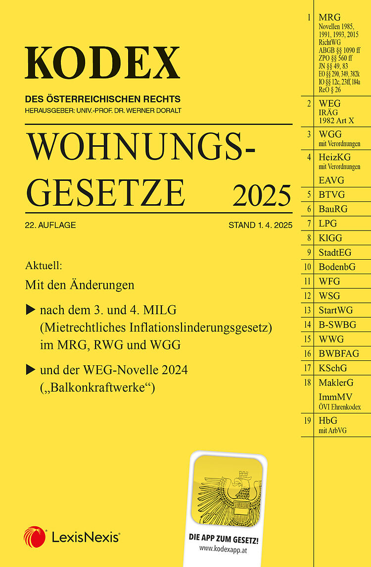 KODEX Wohnungsgesetze, 22. Auflage, Stand 1. 4. 2025 Aktuell: Mit den Änderungen - nach dem 3. und 4. MILG (Mietrechtliches Inflationslinderungsgesetz) im MRG, RWG und WGG - und der WEG-Novelle 2024 (Balkonkraftwerke) Inhalt ...