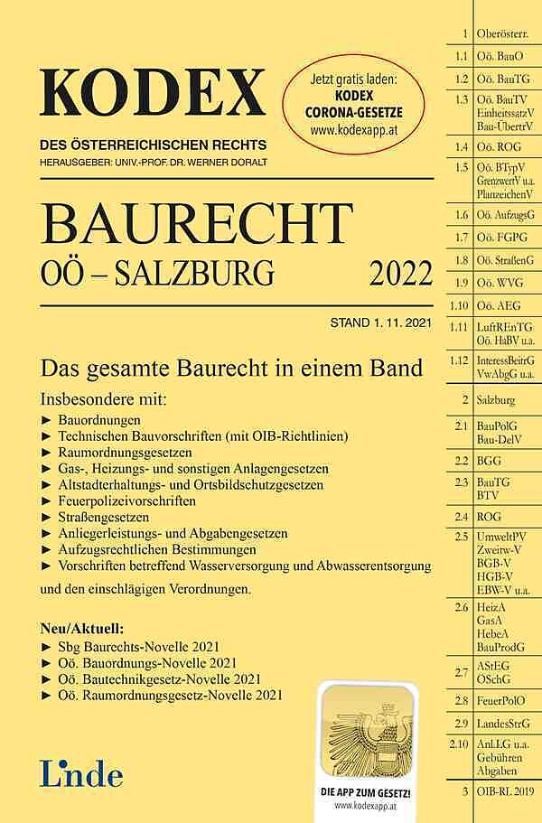 Auflage, Stand 1.11.2021 Mit der App zum Gesetz Das gesamte Baurecht in einem Band Neu/Aktuell Sbg Baurechts-Novelle 2021 Oö. Bauordnungs-Novelle 2021 Oö. Bautechnikgesetz-Novelle 2021 Oö. Raumordnungsgesetz-Novelle 2021 KODEX Baurecht Oberösterreich Salzb...