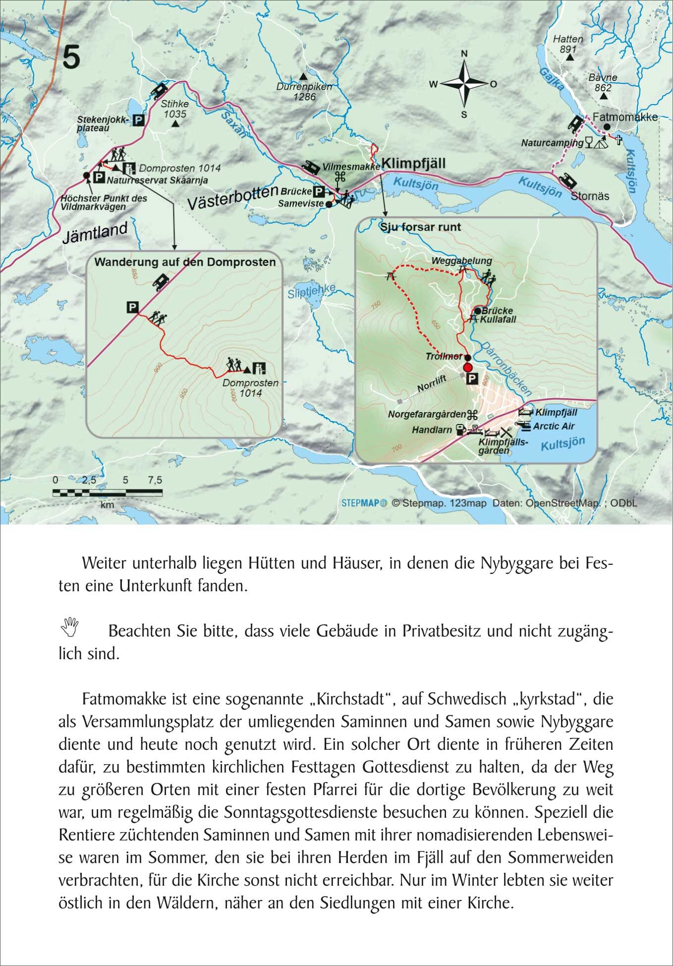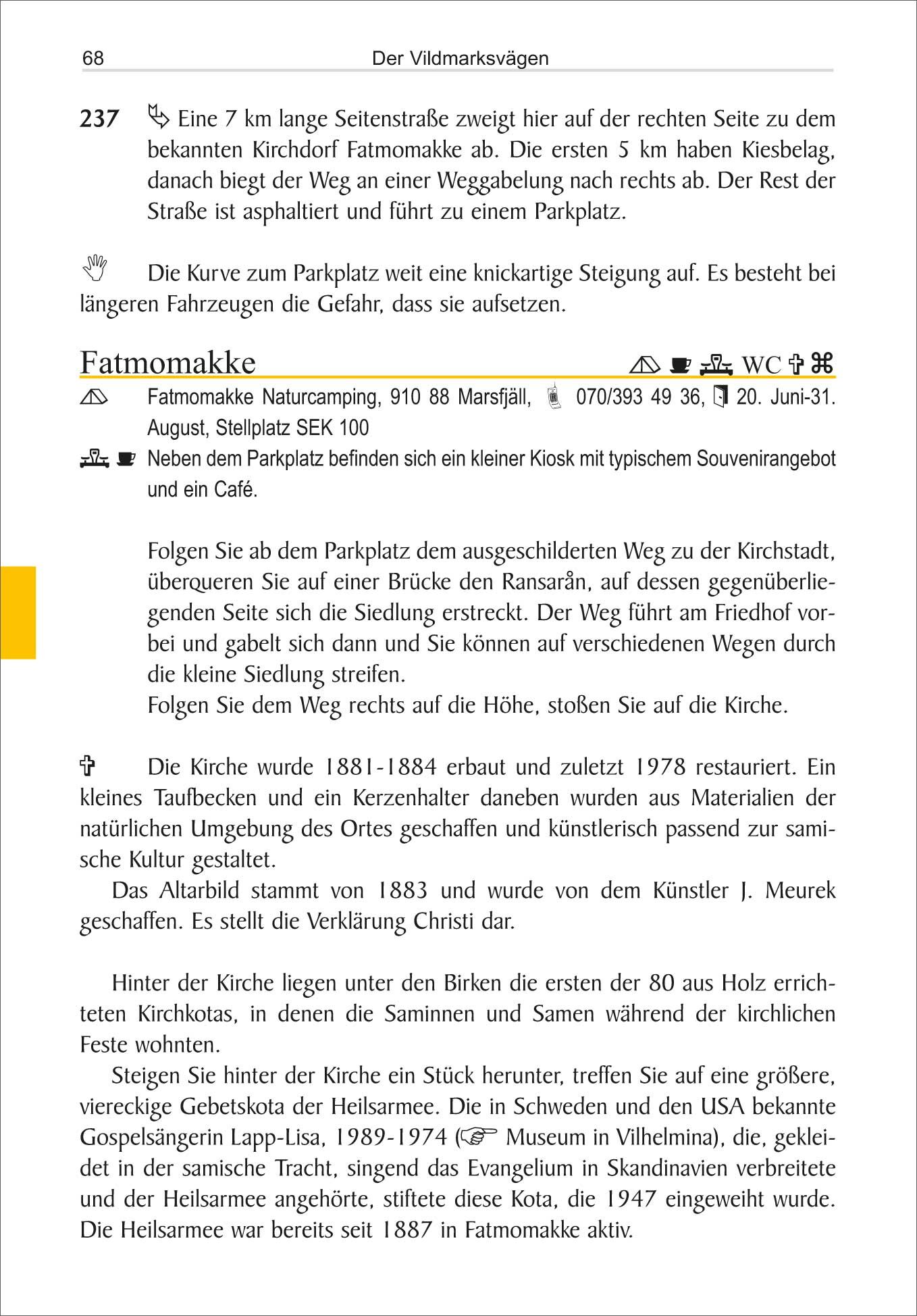 Der 370 km Vildmarksvägen führt aus den dichten Wäldern der Täler von Vilhelmina über Gäddede nach Strömsund auf gut ausgebauter Straße bis hinauf in die Gebirgsregion des Kalfjälls an der norwegischen Grenze. Auf vier Rädern ins Fjäll heißt der Werbeslogan. D...