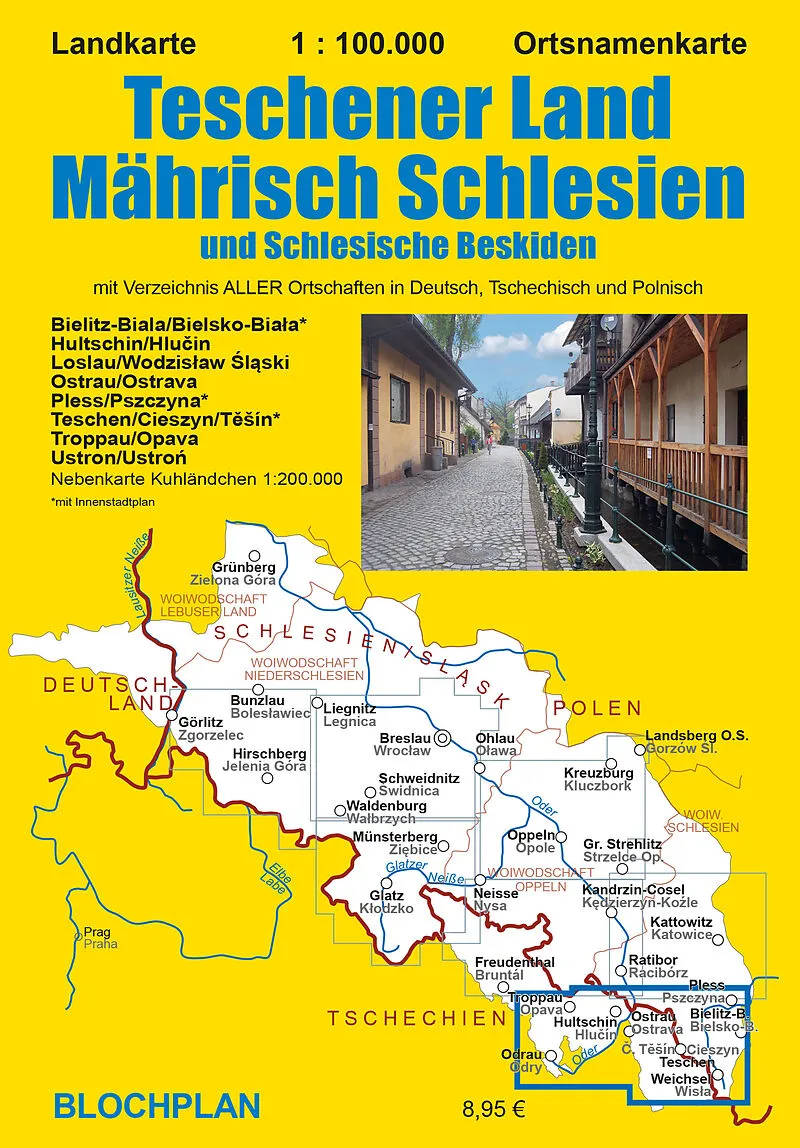 Die Landkarte Teschener Land/Mährisch Schlesien und Schlesische Beskiden zeigt ein Gebiet, das über Jahrhunderte von seinen tschechisch-, polnisch- oder deutschsprachigen Bewohnern geprägt wurde und in dem sich insbesondere im 20. Jahrhundert die Grenzen mehrf...