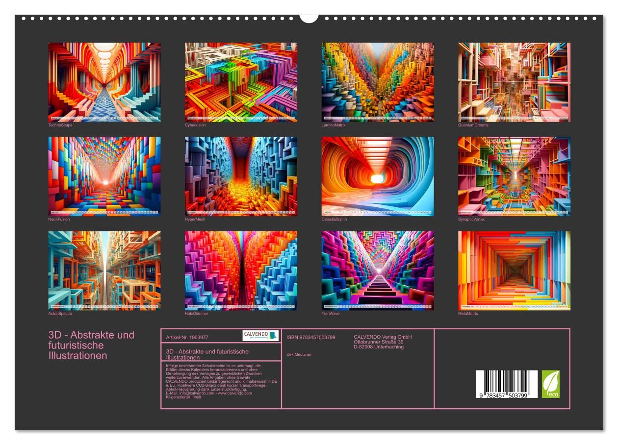 Entdecke eine faszinierende Welt der Kunst mit unserem brandneuen Wandkalender: "3D - Abstrakte und futuristische Illustrationen"! Tauche ein in eine surreale Reise durch die Zeit und den Raum, während du jeden Monat eine atemberaubende 3D-Illustration bewunde...