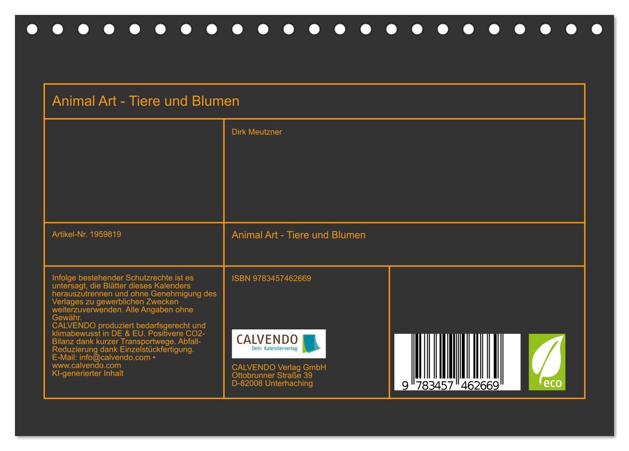 Entdecke die Schönheit der Natur in unserem exquisiten Wandkalender "Animal Art - Blumen und Tiere". Jeder Monat präsentiert eine faszinierende Kombination aus kunstvoll gestalteten Blumen und bezaubernden Tieren, die mithilfe von Photoshop und Künstlicher Int...