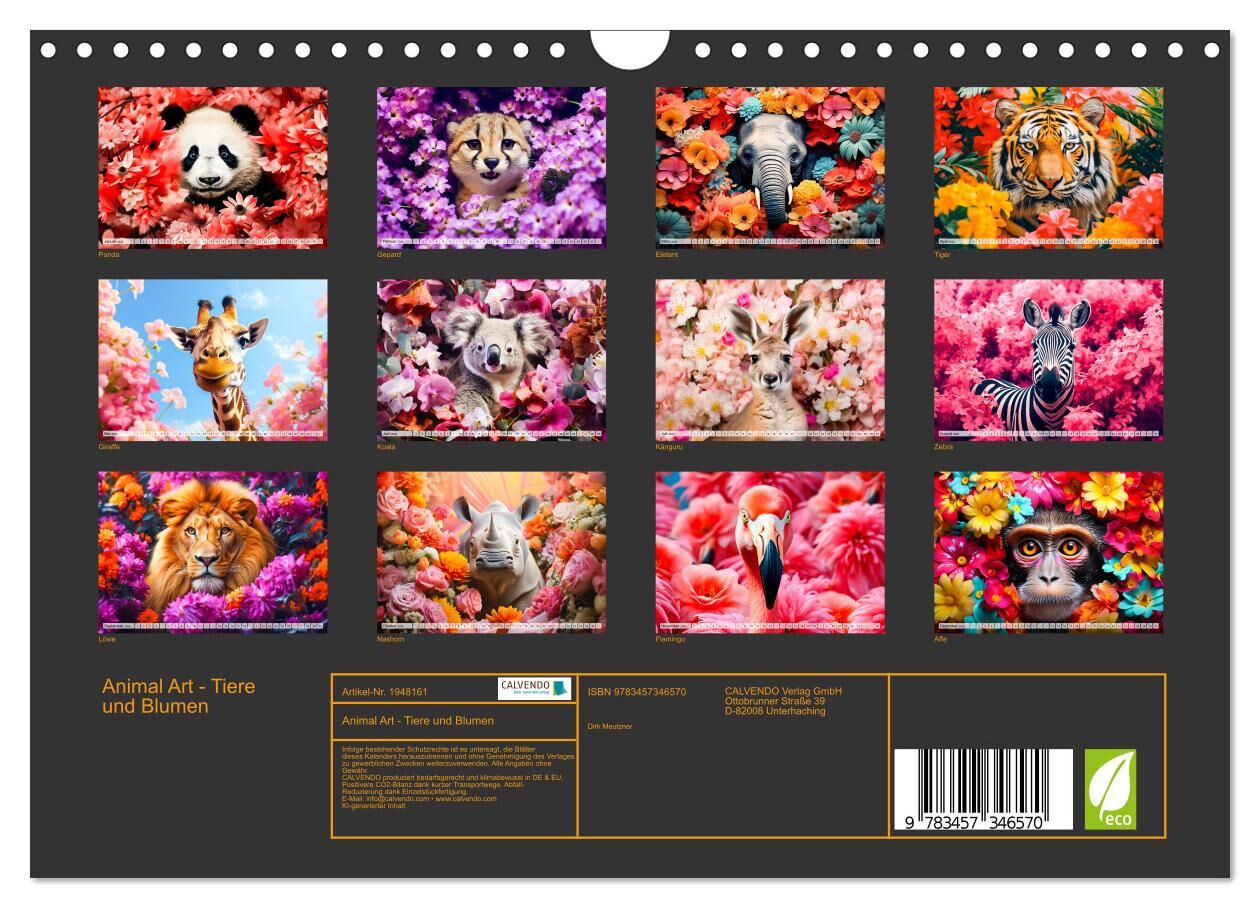 Entdecke die Schönheit der Natur in unserem exquisiten Wandkalender "Animal Art - Blumen und Tiere". Jeder Monat präsentiert eine faszinierende Kombination aus kunstvoll gestalteten Blumen und bezaubernden Tieren, die mithilfe von Photoshop und Künstlicher Int...
