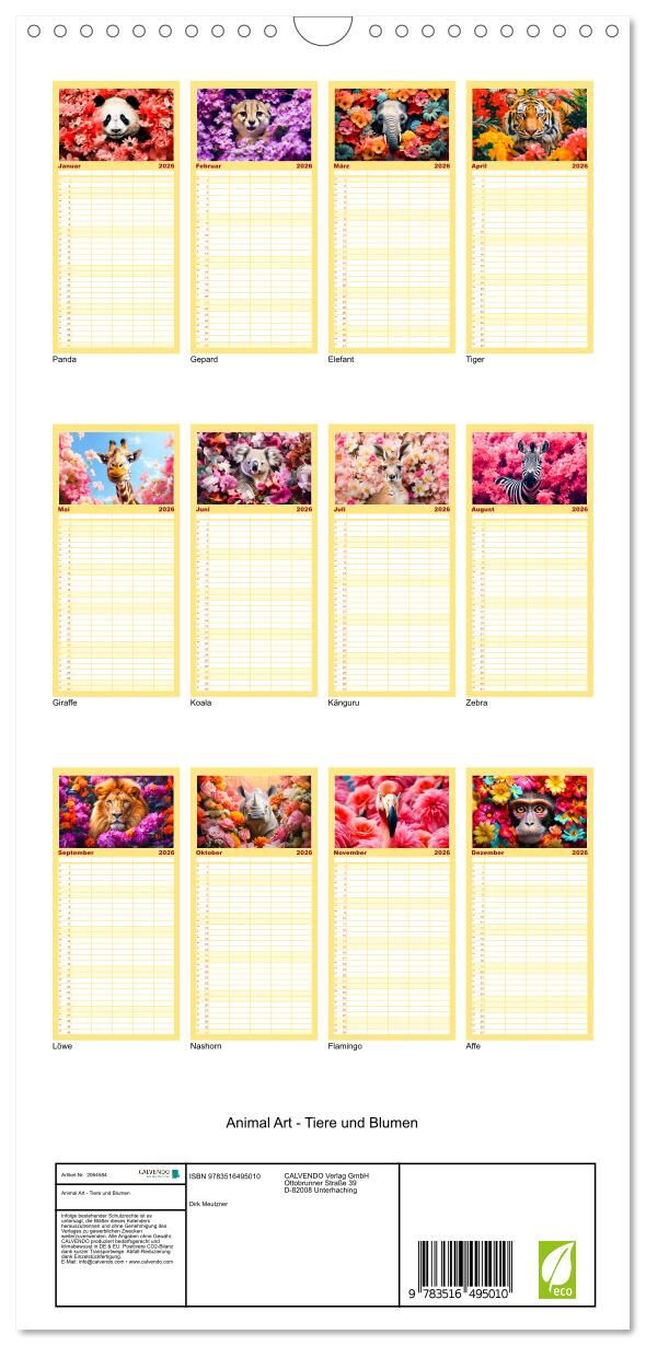 Entdecke die Schönheit der Natur in unserem exquisiten Wandkalender "Animal Art - Blumen und Tiere". Jeder Monat präsentiert eine faszinierende Kombination aus kunstvoll gestalteten Blumen und bezaubernden Tieren, die mithilfe von Photoshop und Künstlicher Int...