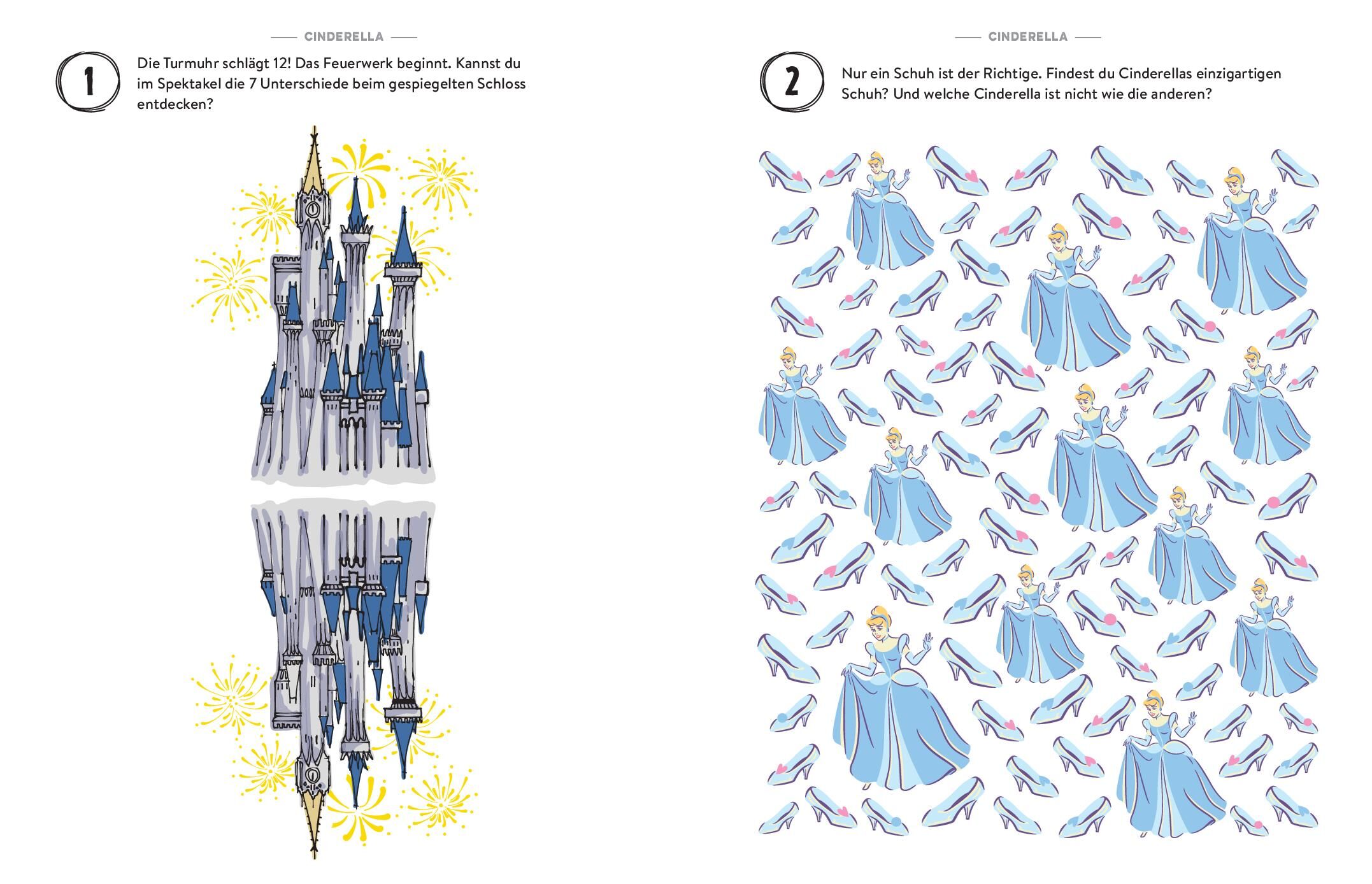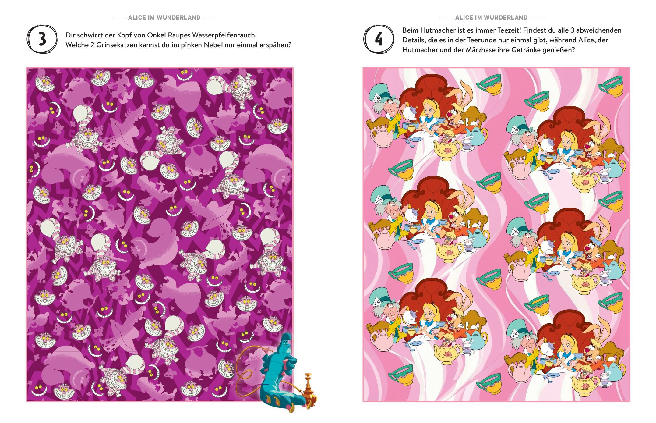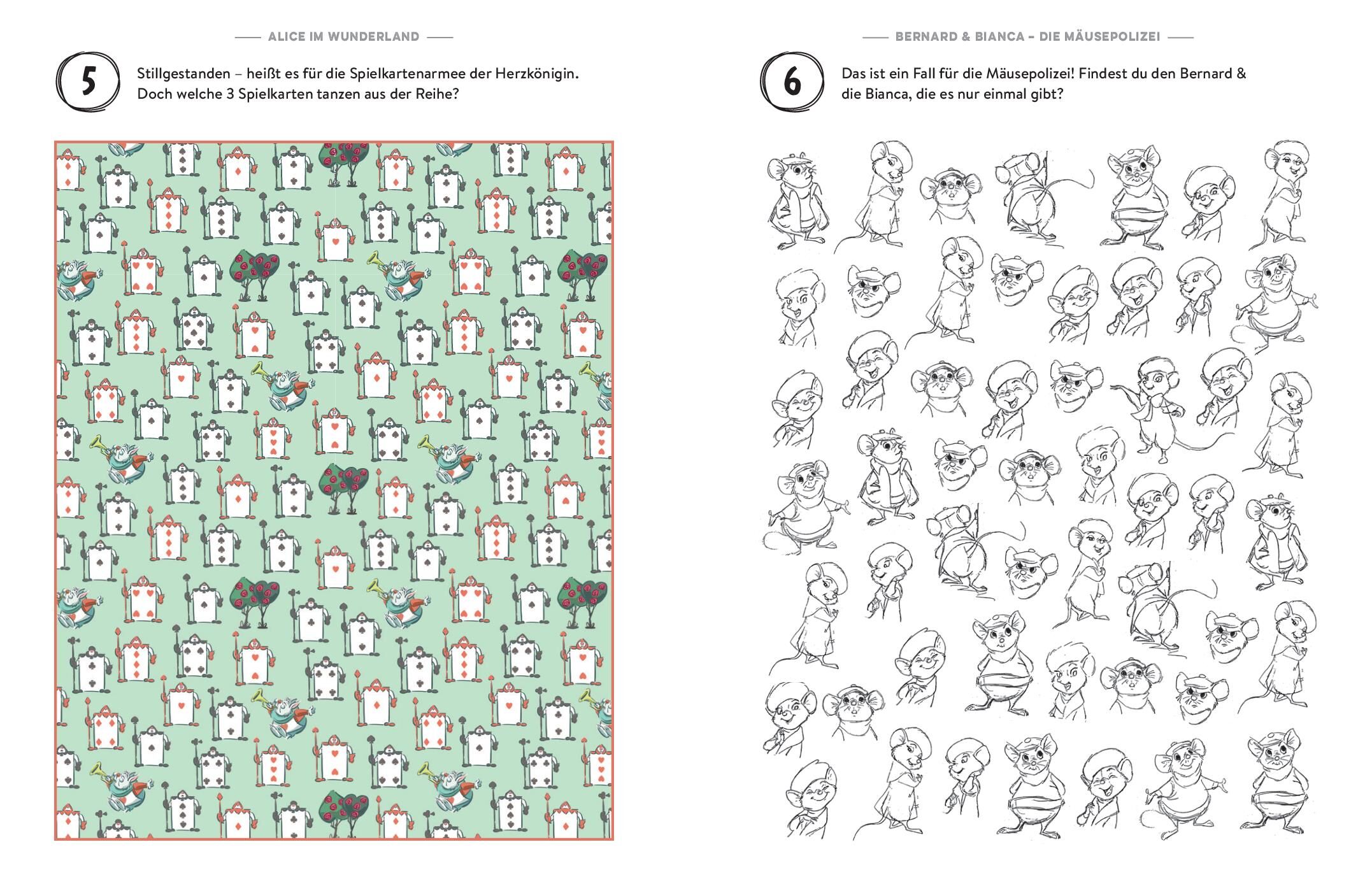 80-mal ist dein Adlerauge gefragt: Mache dich auf die Suche nach Alice' Lieblingstasse für eine Teezeit beim Hutmacher und finde die Spielkarten-Soldaten, die der Herzkönigin aus der Reihe tanzen. Entdeckst du Cinderellas verlorenen Schuh und die Unterschiede zwischen den Märchen-Schlössern? Und an welcher Stelle hat sich Winnie Puuh für ein Nickerchen versteckt? Schau ganz genau hin, dann findest du die versteckten Details.