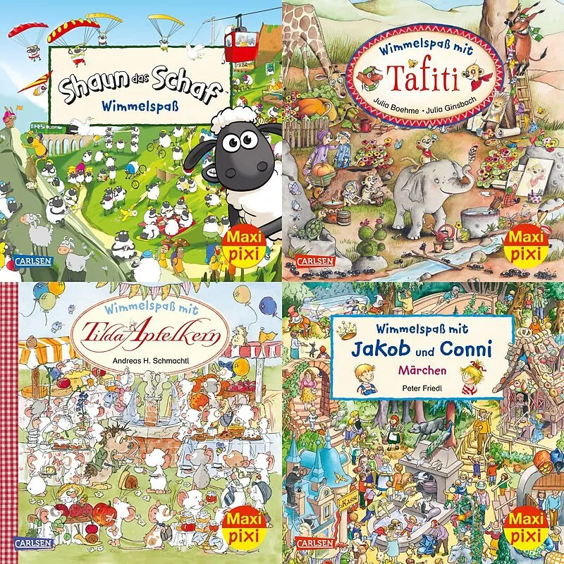 In diesem Maxi-Pixi-Set warten gleich vier Wimmelbücher rund um deine Lieblingshelden: Mit dabei sind Shaun das Schaf, Tilda Apfelkern, Jakob und Conni sowie Tafiti, das kleinen Erdmännchen. Seite für Seite kunterbunte Wimmelbilder zum Suchen, Staunen und Wei...