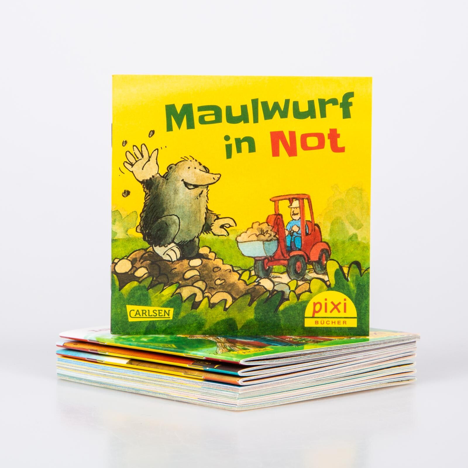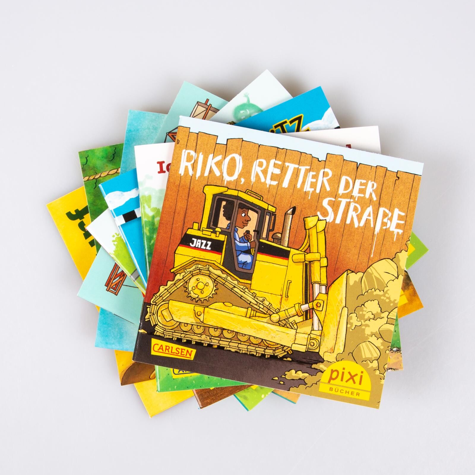Auf der Baustelle ist was los: Bagger schaufeln Erde, Raupen planieren den Boden, Kräne heben Lasten nach und nach entsteht ein Haus. Acht Geschichten für kleine Baumeister und Fans von großen Baufahrzeugen. In der Pixi-Serie "Pixis Fahrzeuge auf der Baustell...