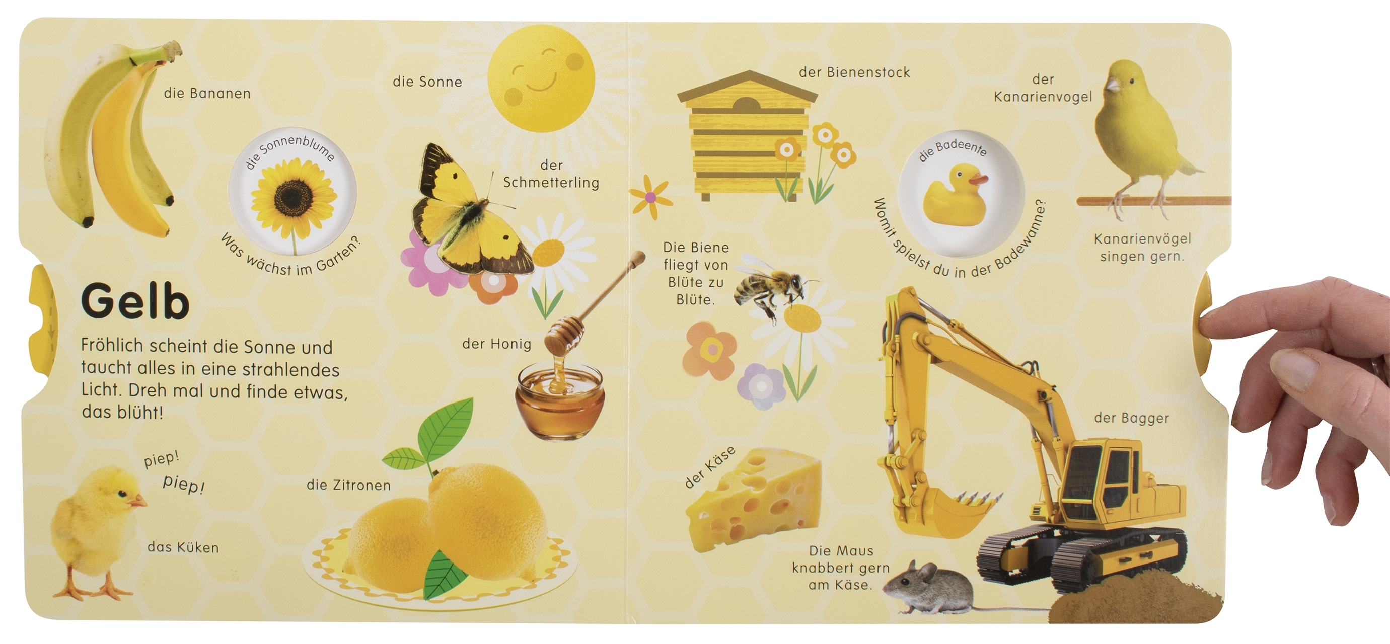 Drehen, entdecken und lernen in der kunterbunten Welt der Farben Von kirschrot über zitronengelb bis froschgrün die Welt ist voller Farben! Dieses Mitmachbuch nimmt Kleinkinder ab 2 Jahren mit in das bunte Treiben. Spannende Gucklöcher und Drehscheiben laden ...