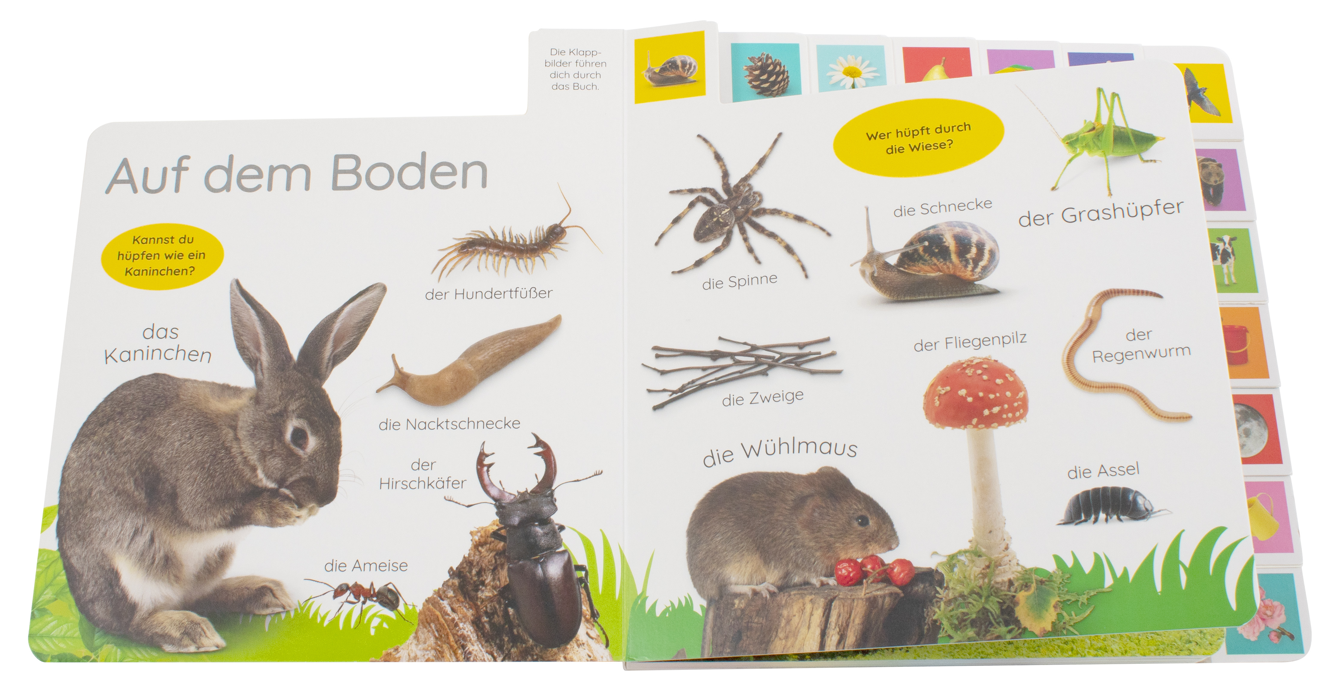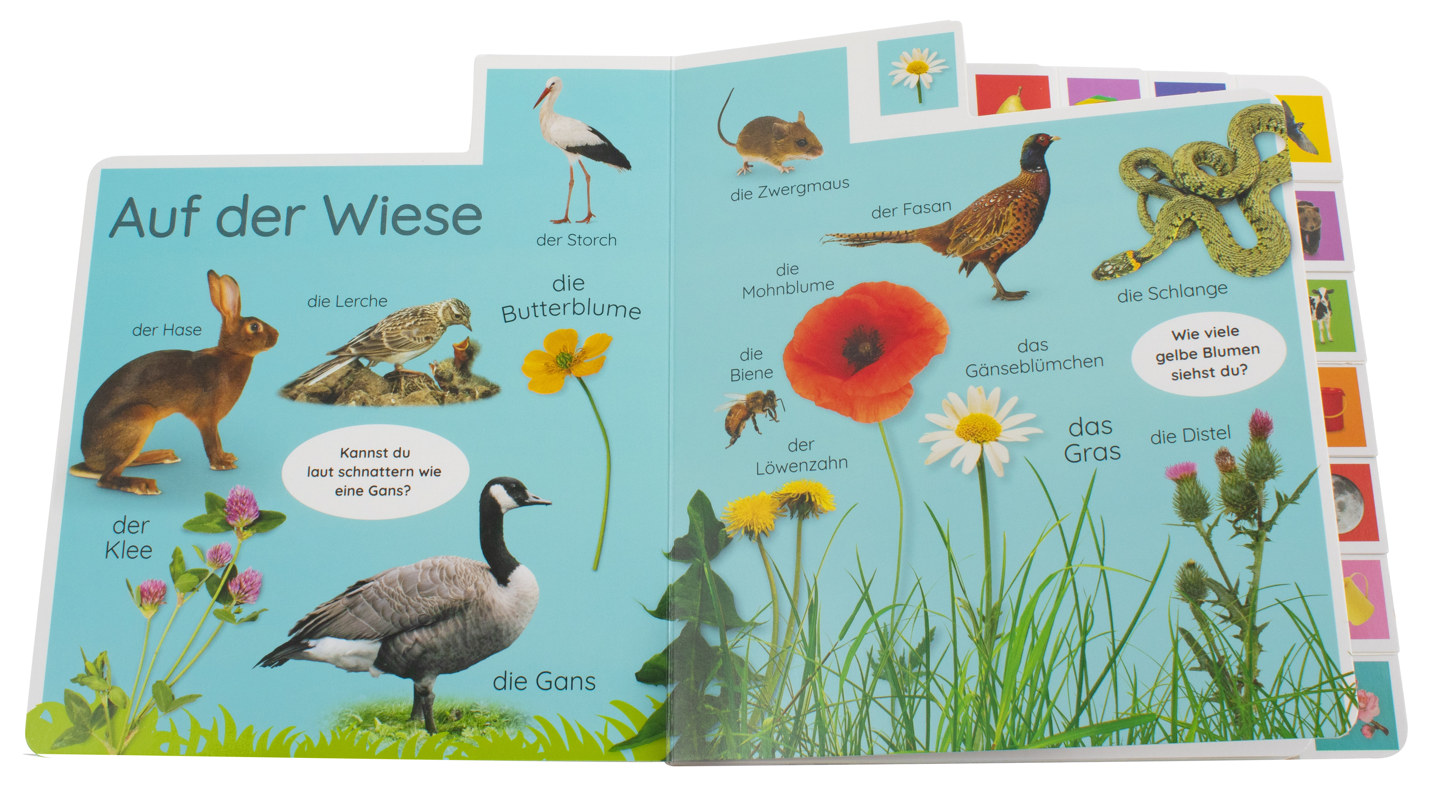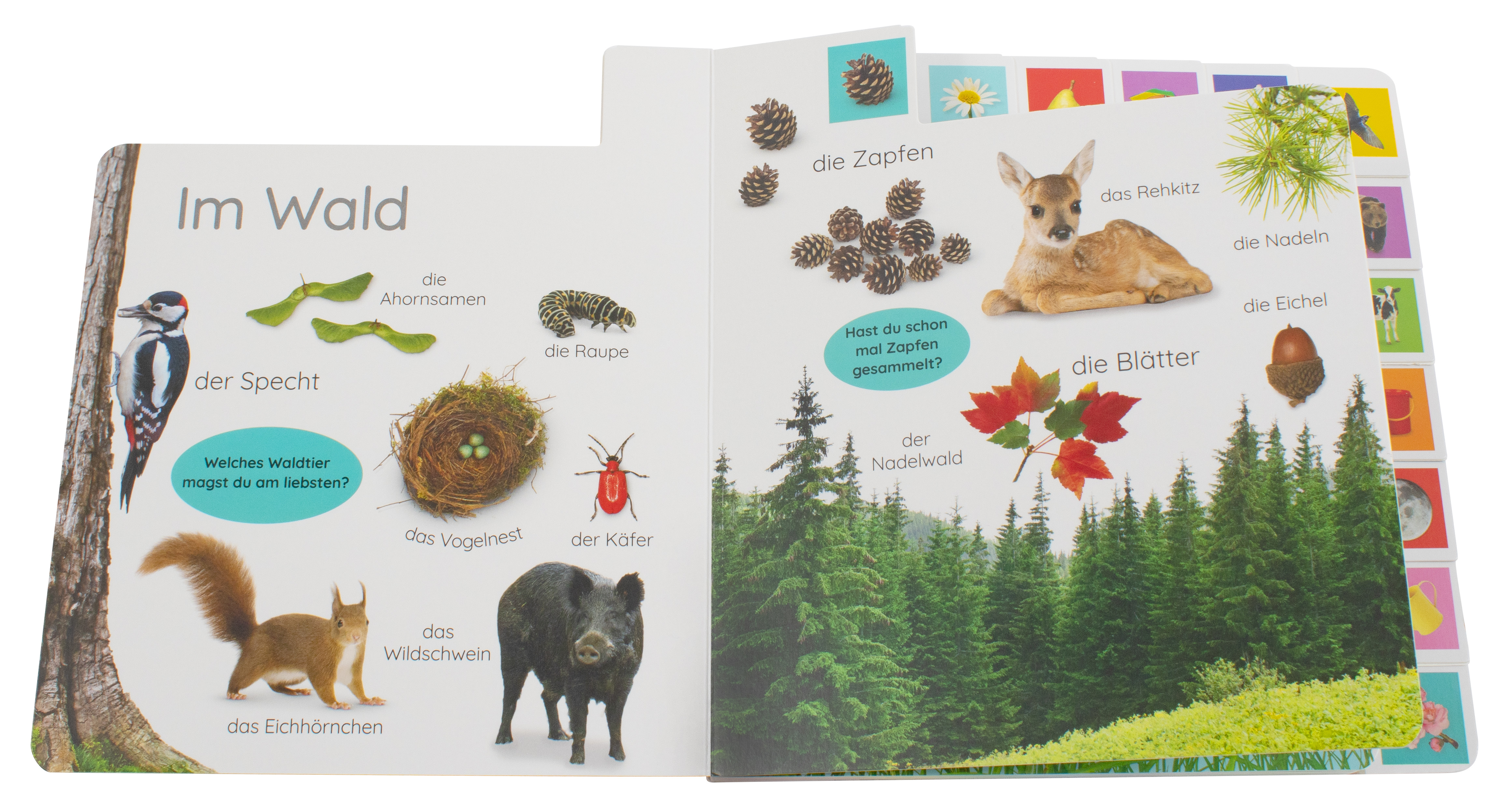 Großes Bildwörterbuch für die Kleinen mit praktischem Griff-Register! Im Wald, auf der Wiese oder am See in diesem Kinderbuch ab 1 Jahr werden viele Tiere und Pflanzen und jede Menge Dinge direkt aus der Lebenswelt von Kleinkindern gezeigt und benannt. Auf üb...