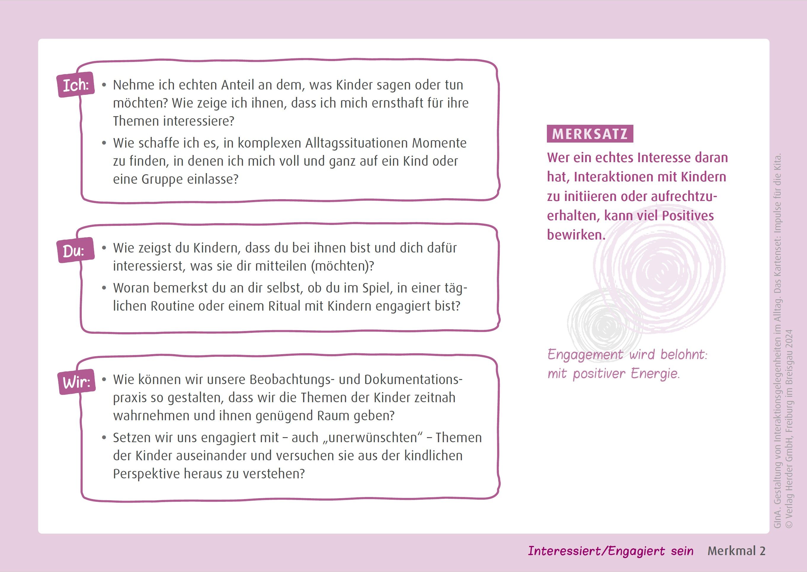 Die GInA-Reflexionskarten unterstützen pädagogische Fachkräfte, sich stärkenorientiert mit Interaktionen in der Kita auseinanderzusetzen. Mit den Reflexionsfragen und Denkanstößen können die vielfältigen alltäglichen Gelegenheiten im Kita-Alltag für Beziehung...