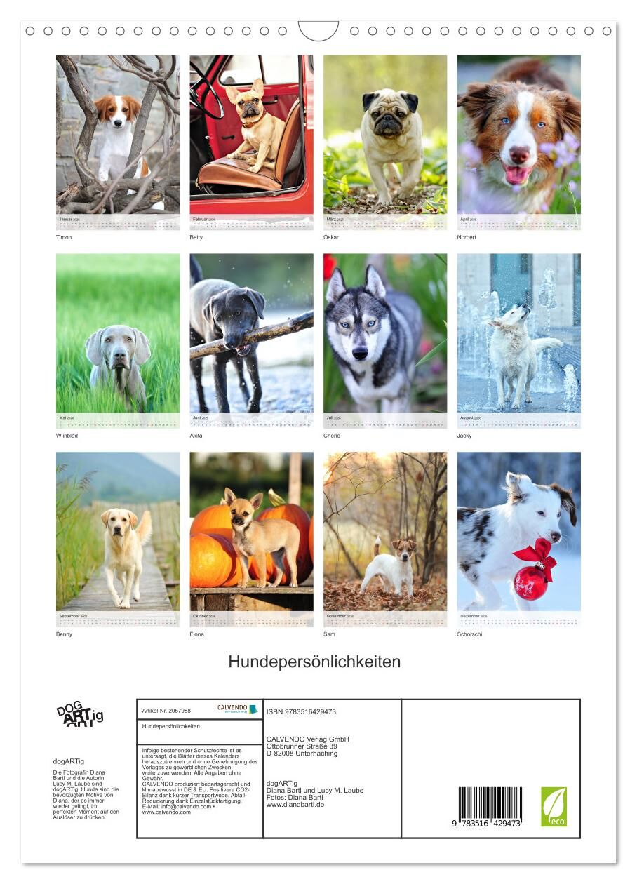Dieser Fotokalender von dogARTig für alle, die Hunde lieben, enthält fröhliche, farbenfrohe Porträts verschiedener Hunderassen vom Chihuahua über den Jack Russell Terrier bis zum Weimaraner. Die Fotos zeigen perfekt die einzigartige Persönlichkeit jedes einzel...