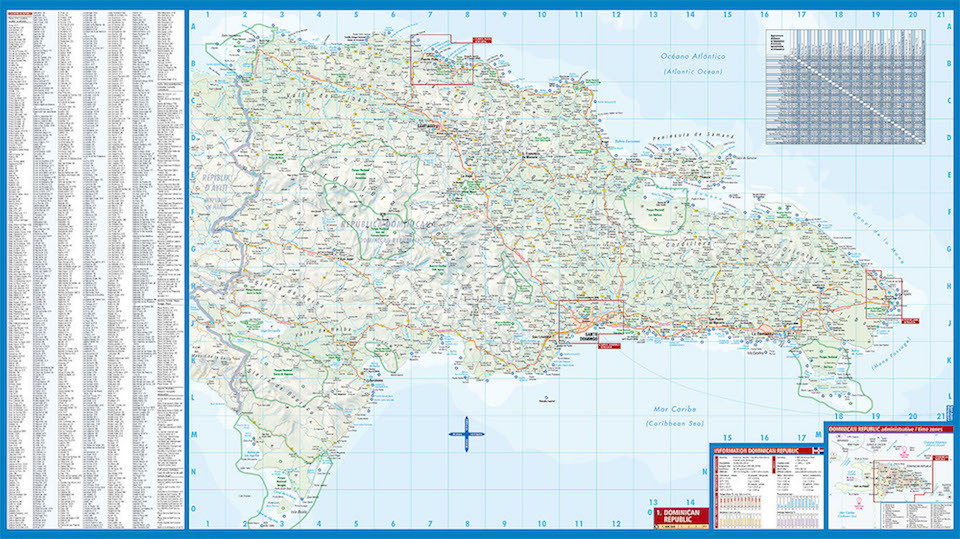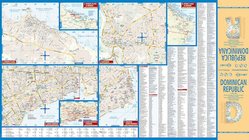 Our laminated and folded Borch Map of the Dominican Republic in the 18th edition contains: Dominican Republic 1:600 000, Puerto Plata & Region 1:250 000, Puerto Plata 1:20 000, Santiago 1:17 500, Santo Domingo & Region 1:250 000, Santo Domingo 1:22 500...