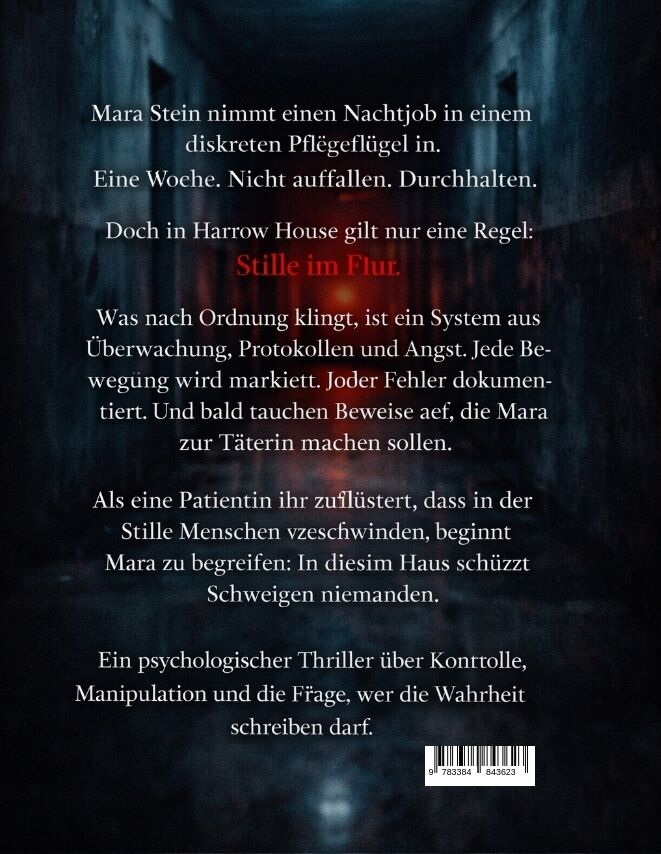 Wie still kann ein Flur sein, bevor er gefährlich wird?Mara Stein nimmt einen Nachtjob in einem diskreten Pflegeflügel an. Nur für eine Woche. Nicht auffallen. Regeln einhalten. Durchhalten.Doch in Harrow House gilt eine Vorschrift, die über allem steht: Still...