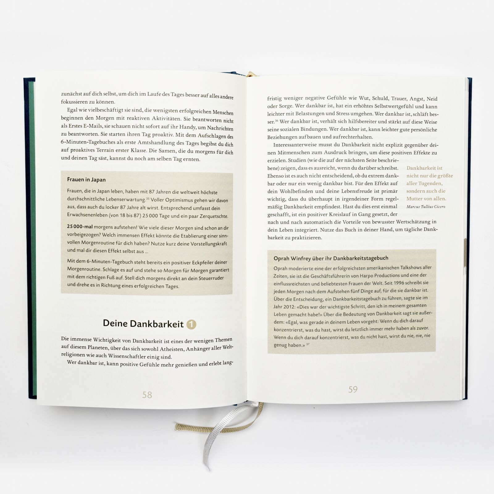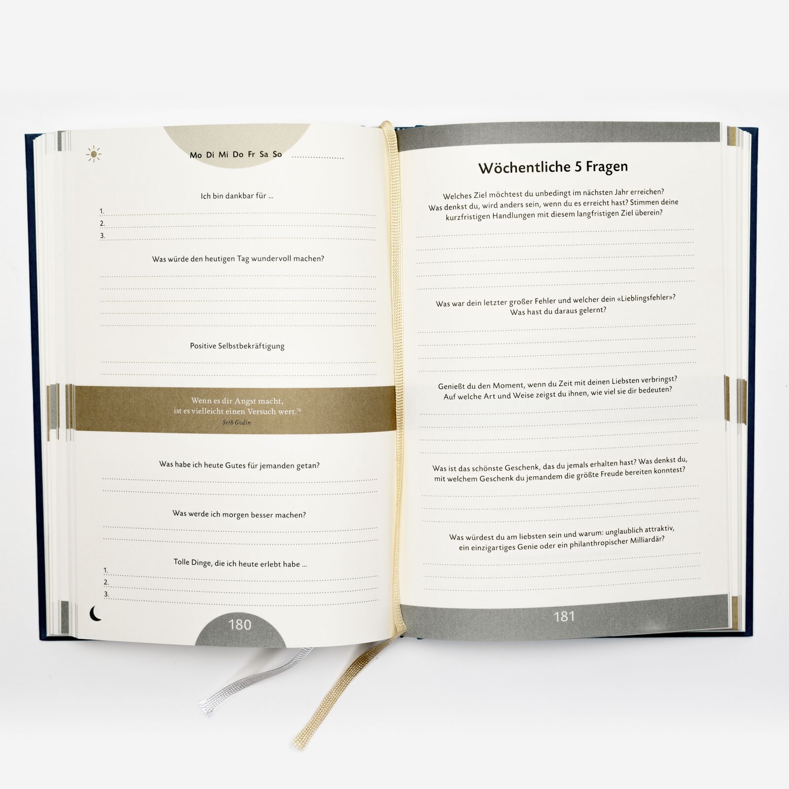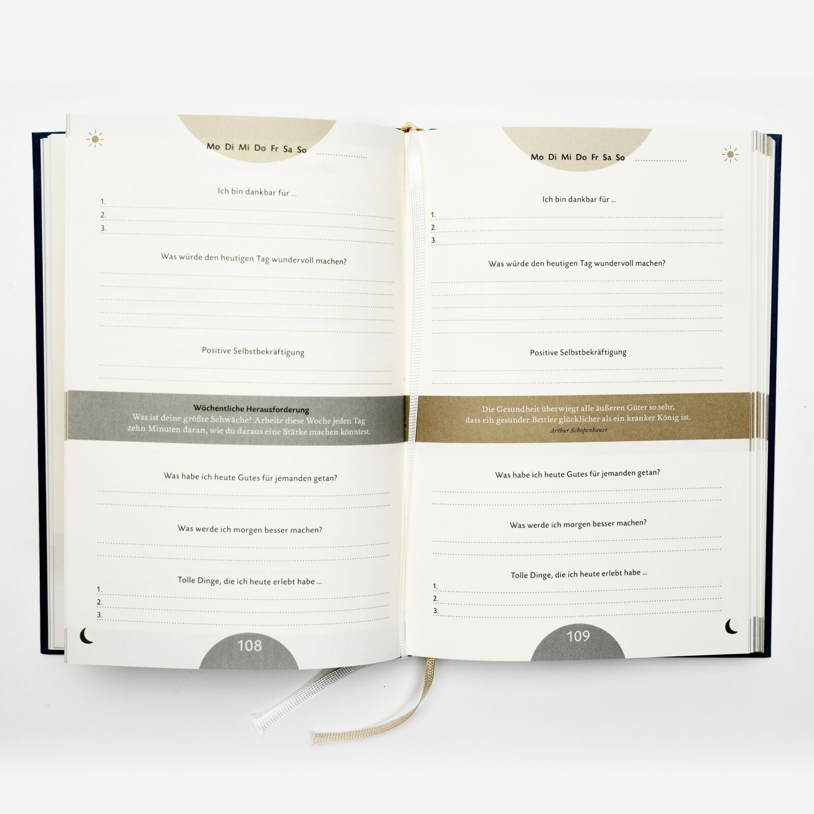 Wer ein gutes Leben will, braucht gute Gedanken und genau das trainierst du mit diesem Tagebuch. Anstatt auf das zu schauen, was fehlt oder nicht passt, hilft es dir, dich auf Fortschritt und das Gute zu fokussieren. In jeweils 3 Minuten am Morgen und am Aben...