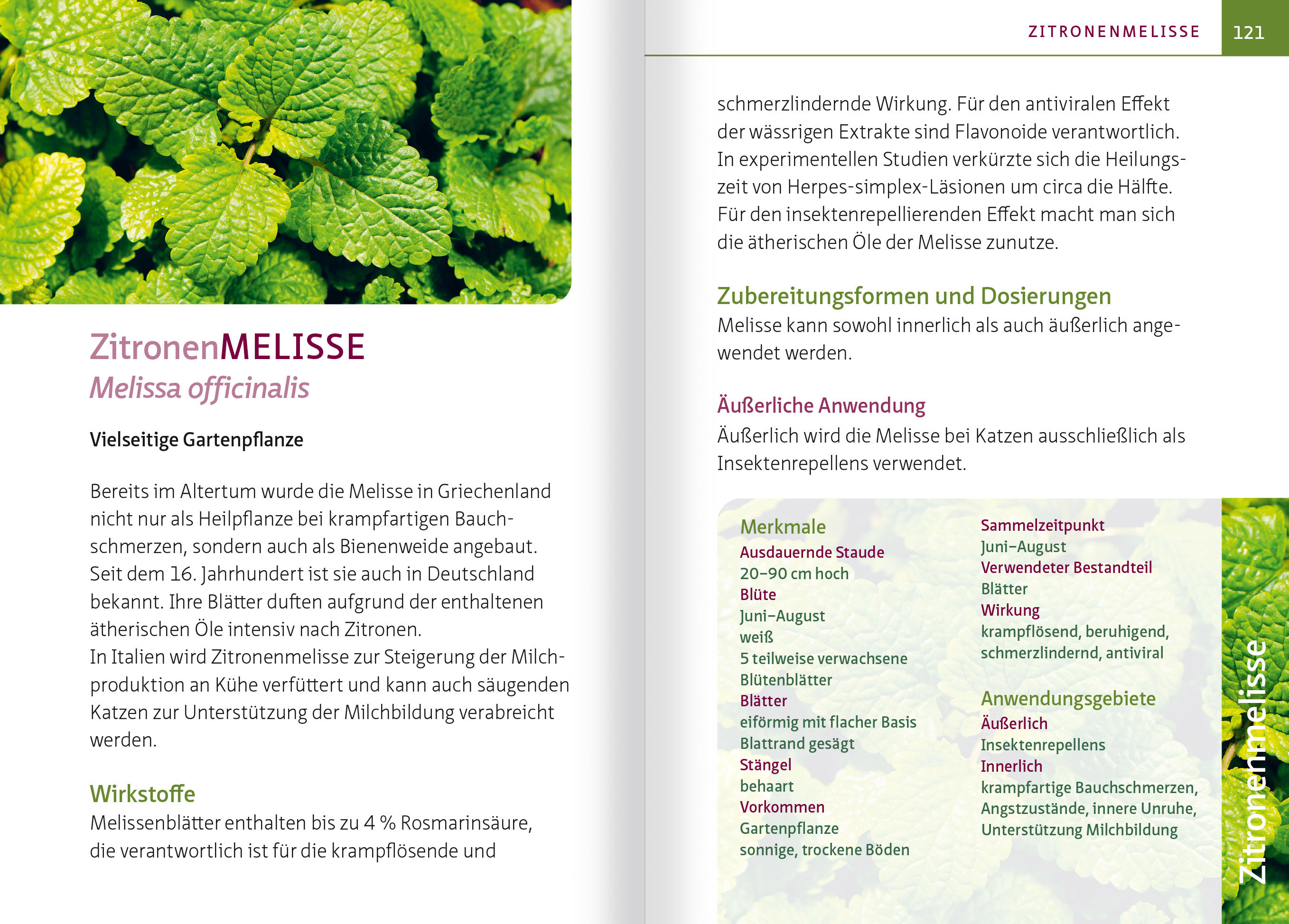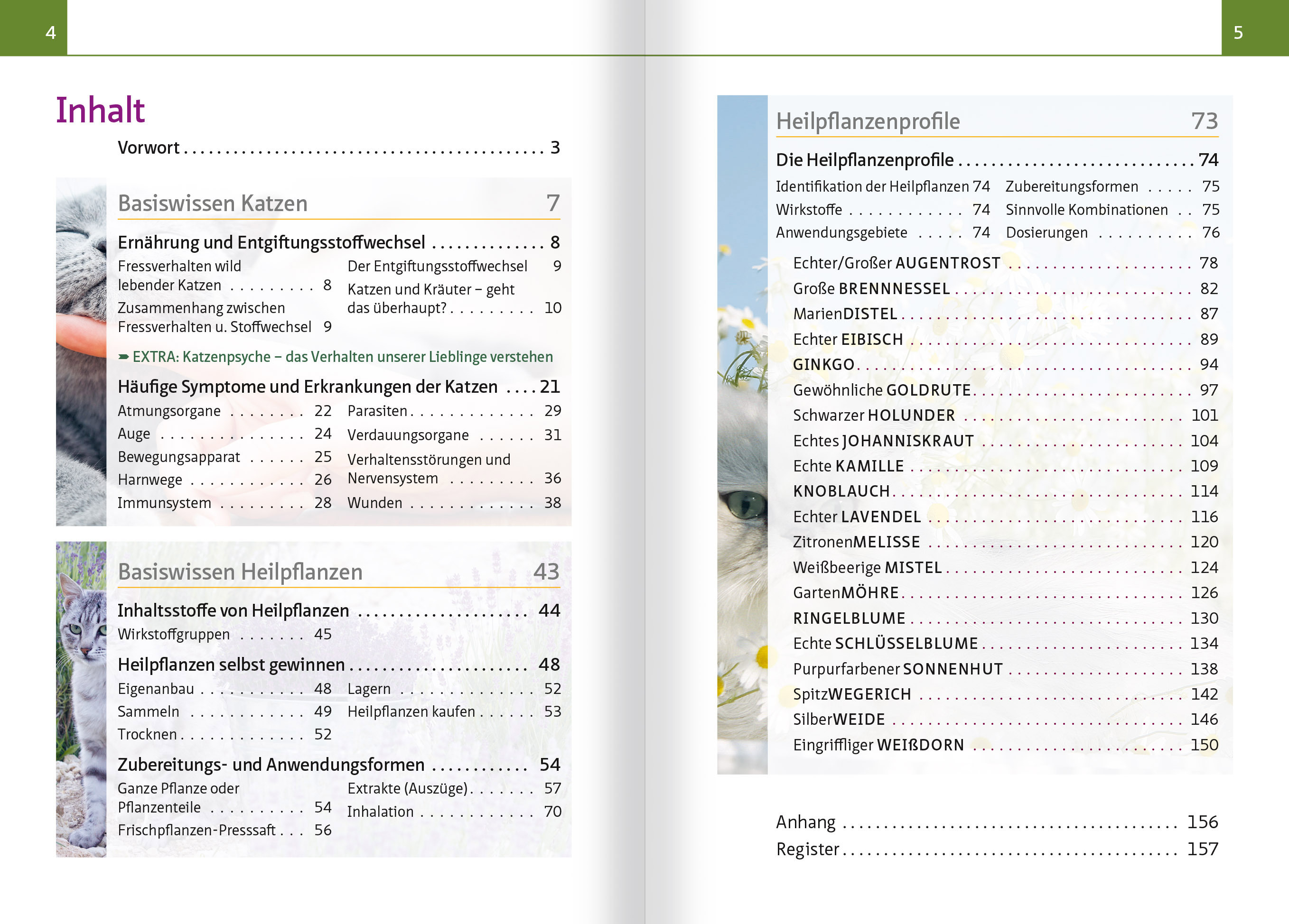 INHALT Vorwort BASISWISSEN KATZEN Ernährung und Entgiftungsstoffwechsel - Fressverhalten wild lebender Katzen - Zusammenhang zwischen Fressverhalten und Stoffwechsel - Der Entgiftungsstoffwechsel - Katzen und Kräuter - geht das überhaupt? EXTRA: Katzenpsyche - das Verhalten unserer Lieblinge verstehen Häufige Symptome und Erkrankungen der Katzen - Atmungsorgane - Auge - Bewegungsapparat - Harnwege - Immunsystem - Parasiten - Verdauungsorgane - Verhaltensstörungen und Nervensystem - Wunden BASISWISSEN HEILPFLANZEN Inhaltsstoffe von Heilpflanzen -Wirkstoffgruppen Heilpflanzen selbst gewinnen - Eigenanbau - Sammeln - Trocknen - Lagern - Heilpflanzen kaufen Zubereitungs- und Anwendungsformen - Ganze Pflanze oder Pflanzenteile - Frischpflanzen-Presssaft - Extrakte (Auszüge) - Inhalation HEILPFLANZENPROFILE Die Heilpflanzenprofile - Identifikation der Heilpflanzen - Wirkstoffe - Anwendungsgebiete - Zubereitungsformen - Sinnvolle Kombinationen - Dosierungen Echter/Großer AUGENTROST Große BRENNNESSEL MarienDISTEL Echter EIBISCH GINKGO Gewöhnliche GOLDRUTE Schwarzer HOLUNDER Echtes JOHANNISKRAUT Echte KAMILLE KNOBLAUCH Echter LAVENDEL ZitronenMELISSE Weißbeerige MISTEL GartenMÖHRE RINGELBLUME Echte SCHLÜSSELBLUME Purpurfarbener SONNENHUT SpitzWEGERICH SilberWEIDE Eingriffliger WEIßDORN Anhang Register