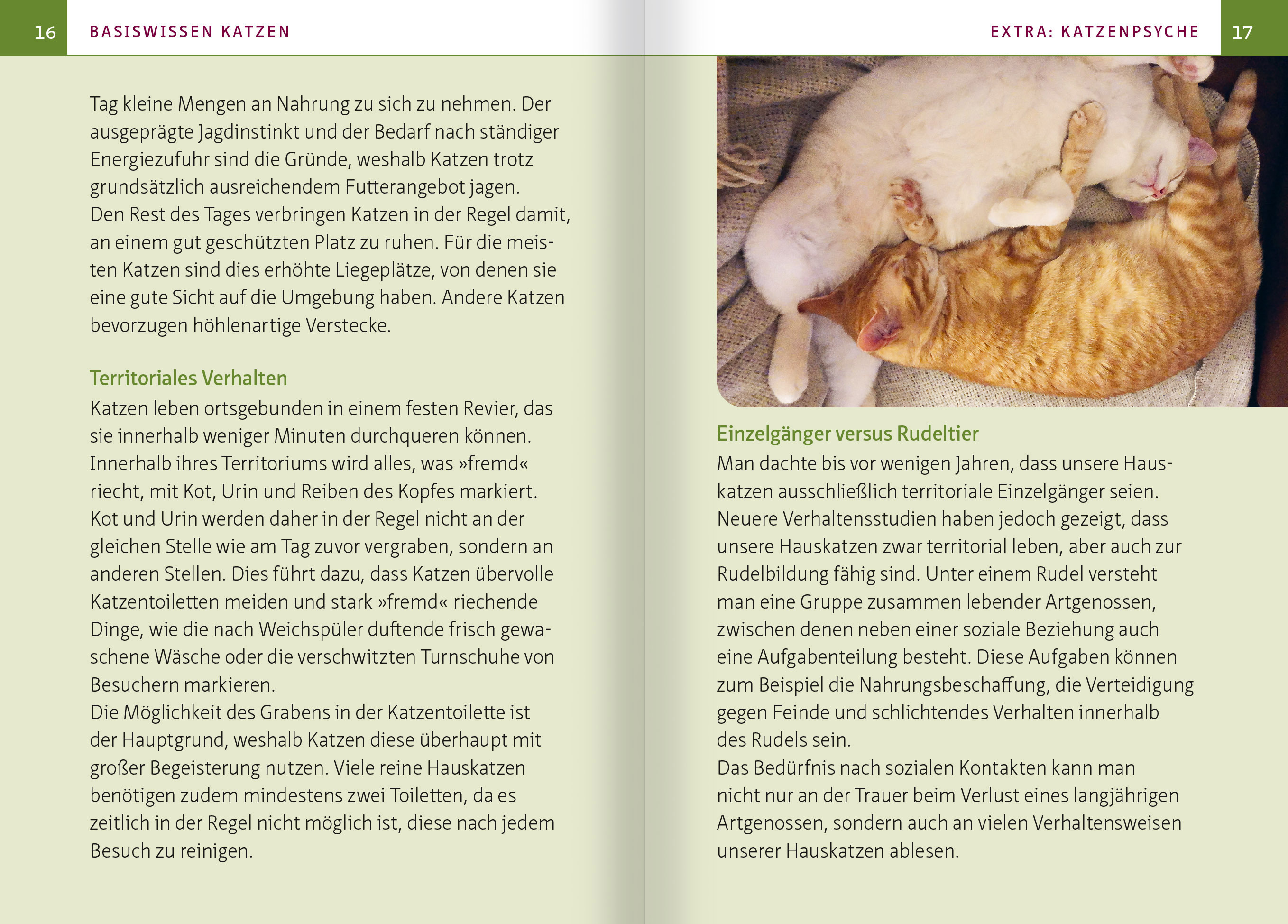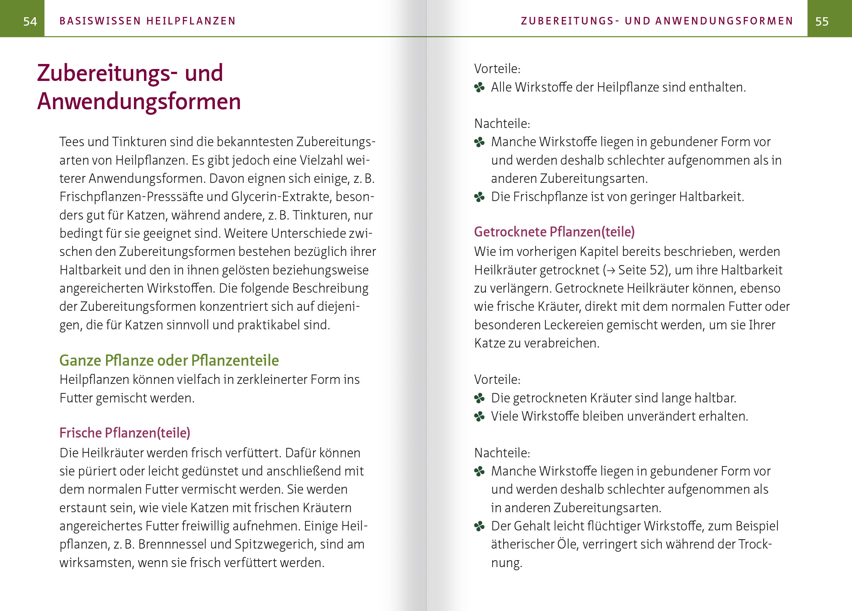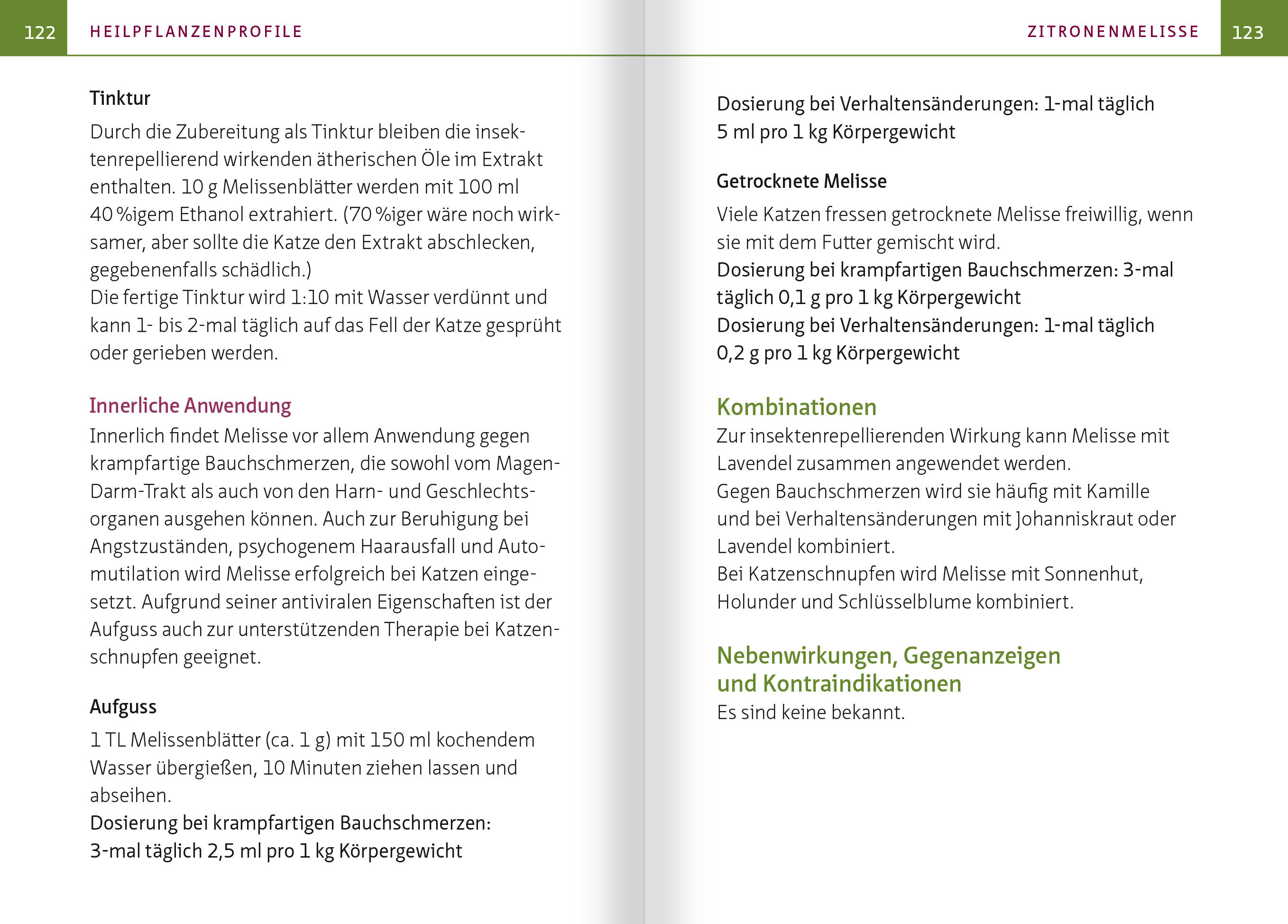 ((Auszug aus dem Kapitel "Basiswissen Katzen")) KATZEN UND KRÄUTER - GEHT DAS ÜBERHAUPT? Jeder Katzenbesitzer ist vermutlich schon einmal am anspruchsvollen Geschmackssinn seiner Katze verzweifelt. Es gibt Samtpfoten, denen für jede Mahlzeit eine andere Futtersorte angeboten werden muss, sonst treten sie in den Hungerstreik. Wiederum andere ziehen es vor, jeden Tag exakt dasselbe Futter zu erhalten, und verweigern bereits bei Anbruch einer neuen Charge das Fressen. Am schlimmsten ist es, wenn man versucht, ihnen Arzneimittel zu verabreichen. Jedes noch so geschickte Versteck in Butter oder Streichwurst scheint entdeckt zu werden, und die Leckerei wird entweder komplett verschmäht oder die Tablette säuberlich abgeschleckt ausgespuckt. Wie soll man denn in unsere Katzen Heilkräuter hineinbringen, die meistens extrem bitter schmecken, wenn sie sich bereits bei nach Fleisch oder Vanille schmeckenden Fertigarzneimitteln schon so anstellen? Die Antwort ist überraschend einfach: Viele Katzen nehmen im Krankheitsfall Kräuter freiwillig auf. Dafür verantwortlich sind zwei Mechanismen, die sogenannte Bitterstofftoleranz und die Fähigkeit zur Selbstmedikation. --- WICHTIG: Katzen haben einen besonderen Stoffwechsel und benötigen daher spezielle Dosierungen von Arzneimitteln und Heilpflanzen. Es ist nicht möglich, die Dosierung von Hunden oder Menschen einfach auf das entsprechende Körpergewicht umzurechnen. --- BITTERSTOFFTOLERANZ Bitterstoffe (Tannine) sind in der Pflanzenwelt häufig ein Zeichen für Giftigkeit und werden deshalb von den meisten Tieren gemieden. An kranken Wildtieren, z. B. Hirschen und Affen, hat man jedoch beobachtet, dass diese im Krankheitsfall auch bittere Pflanzen zu sich nehmen. Die Beobachtungen an Wildtieren hat man zum Anlass genommen, um die Bitterstofftoleranz bei Mäusen, Wiederkäuern, Menschen und anderen Säugetieren experimentell zu untersuchen. Es zeigte sich, dass im Krankheitsfall Bitterstoffe nicht nur in höherem Maße akzeptiert, sondern bei Tieren auch gezielt verzehrt wurden. Auch Katzen haben im Krankheitsfall eine erhöhte Bitterstofftoleranz. FÄHIGKEIT ZUR SELBSTMEDIKATION Unter Selbstmedikation verstehen wir die im Krankheitsfall gezielte Aufnahme von Substanzen, die nicht zum normalen Nahrungsspektrum einer Tierart gehören und deren Konsum zu einer Heilung oder Symptomlinderung führt. Dies kann bei wild lebenden Tieren immer wieder beobachtet werden. Zum Beispiel fressen Nashörner mit starkem Durchfall große Mengen der adstringierenden Mangrovenrinde. Auch bei wild lebenden Tigern ist die Fähigkeit zur Selbstmedikation schon beobachtet worden: Bei starkem Wurmbefall fressen sie gezielt größere Mengen unverdauliches Gras, welches sich um die im Darm lebenden Würmer wickelt, sodass diese mit dem Kot ausgeschieden werden. Die grundsätzliche Fähigkeit zur Selbstmedikation ist auch in unseren Hauskatzen noch erhalten. Immer wieder beobachten wir, dass unsere Katzen bei Übelkeit große Mengen Gras fressen, welches anschließend inklusive der Übelkeit auslösenden Ursache erbrochen wird. Wenn Sie Ihre Katze mit Heilpflanzen behandeln, werden Sie erleben, dass die Fähigkeit zur Selbstmedikation Ihrer Katze sich nicht nur auf Gras und Erbrechen beschränkt. Viele, aber leider nicht alle Katzen wissen instinktiv, ob und wie lange sie ein Arzneimittel oder eine Heilpflanze wirklich benötigen.