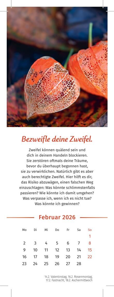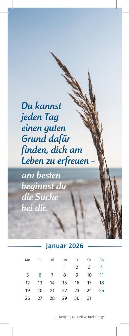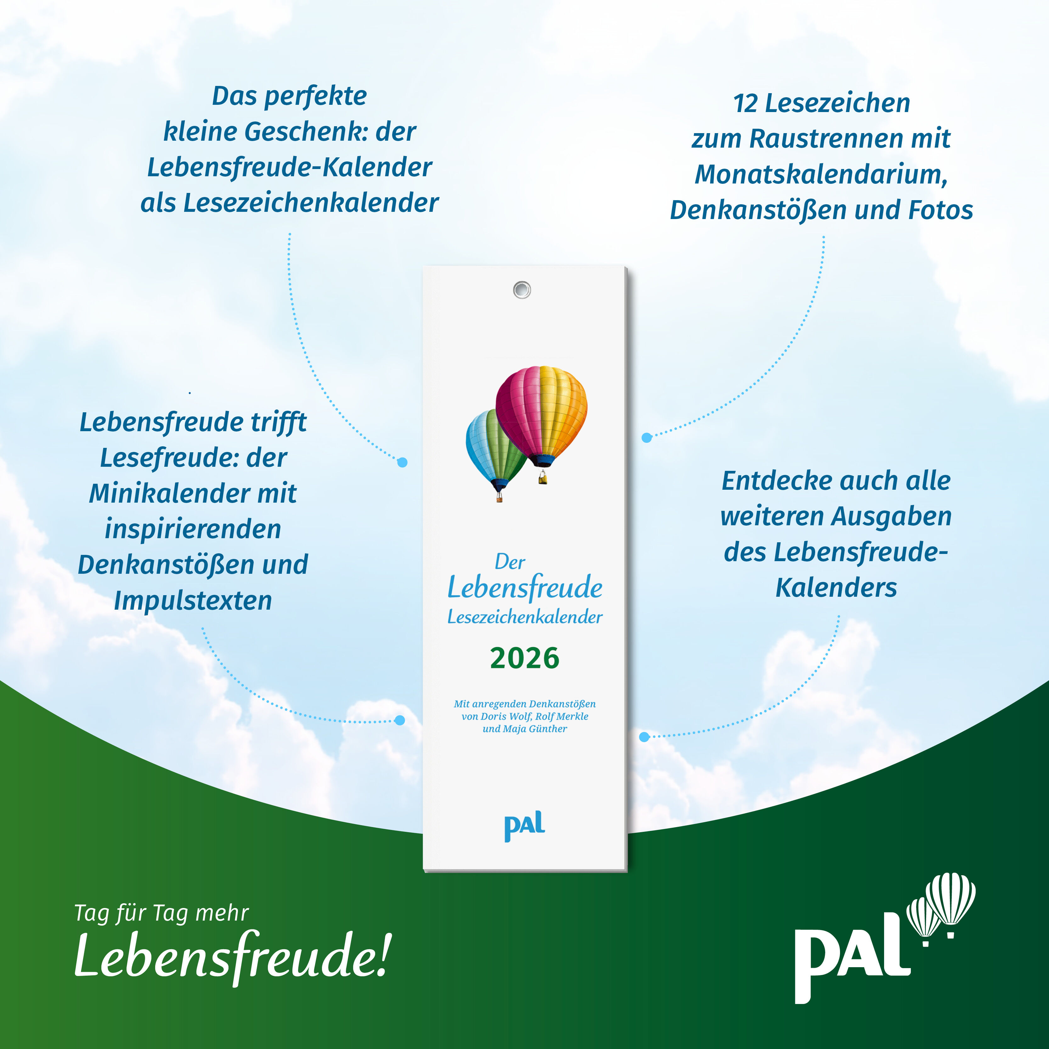 Der Lebensfreude-Lesezeichenkalender 2026. Aufbauende Denkanstöße, Sprüche und positive Gedanken, motivierende und leicht verständliche psychologische Impulstexte und Anregungen, gestaltet mit atmosphärischen Naturfotos. 12 Lesezeichen zum Raustrennen mit Mona...