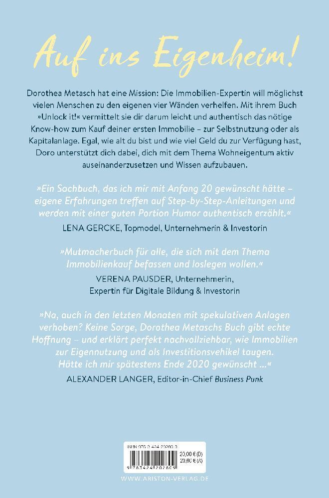 Dorothea Metasch hat eine Mission. Die Immobilien-Expertin will möglichst vielen Menschen zu den eigenen vier Wänden verhelfen. Mit ihrem Buch Unlock it! vermittelt sie dir darum leicht und authentisch das nötige Knowhow zum Kauf deiner ersten Immobilie zur Se...