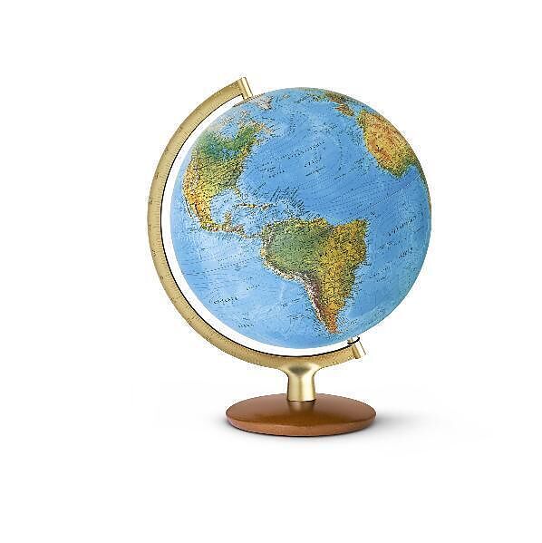 DPI 3017 Doppelbild-Leuchtglobus, unbeleuchtet physisch mit Satellitendaten erstellte Kartografie/ beleuchtet politisch, 30 cm Durchmesser, Echtholzfuß kirschbaumfarben, skalierter Metallmeridian goldfarben, Kabel im Meridian integriert und mit schwarzem Schnu...