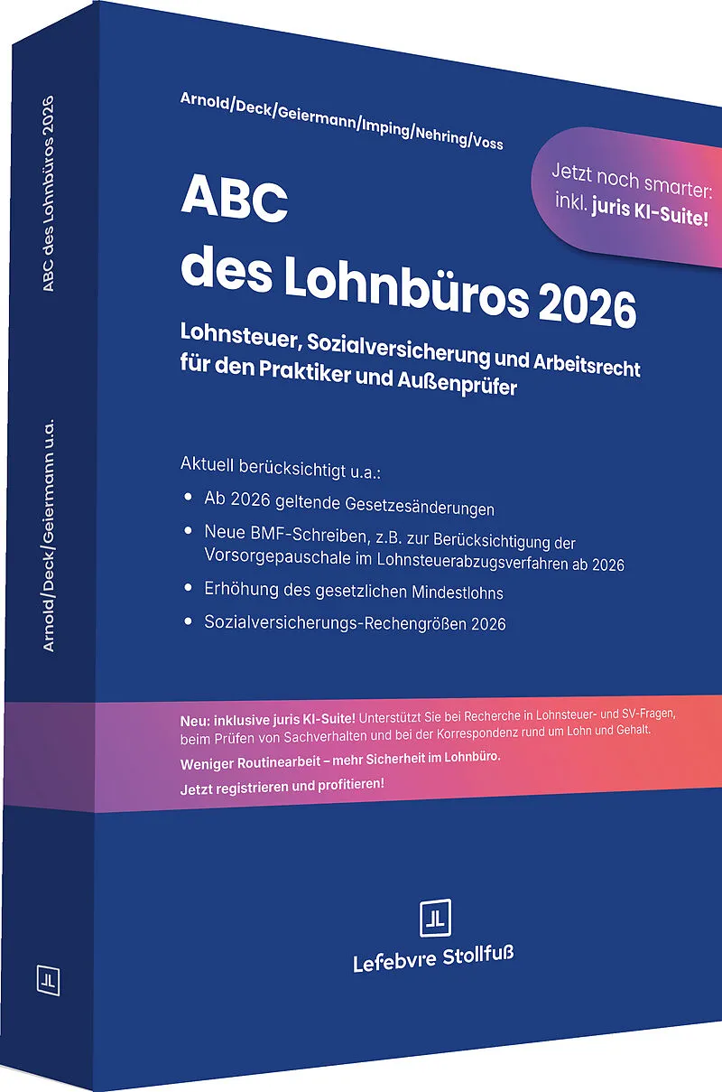 Das ABC des Lohnbüros 2026 bietet Ihnen ausführliche Erläuterungen und Hilfestellungen zu allen Fragen der Lohn- und Gehaltsabrechnung, zugänglich über zahlreiche Suchbegriffe von A wie Abfindungen bis Z wie Zuschläge. Die Beiträge des ABC-Teils berücksichtig...