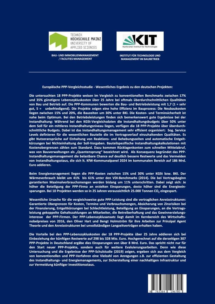Die untersuchten 18 PPP-Projekte weisen im Vergleich zu konventionellen Benchmarks zwischen 17% und 35% günstigere Lebenszykluskosten über 25 Jahre bei oftmals überdurchschnittlichen Qualitäten von Bau und Betrieb auf. Die PPP-Kommunen bewerten die Bau- und Be...
