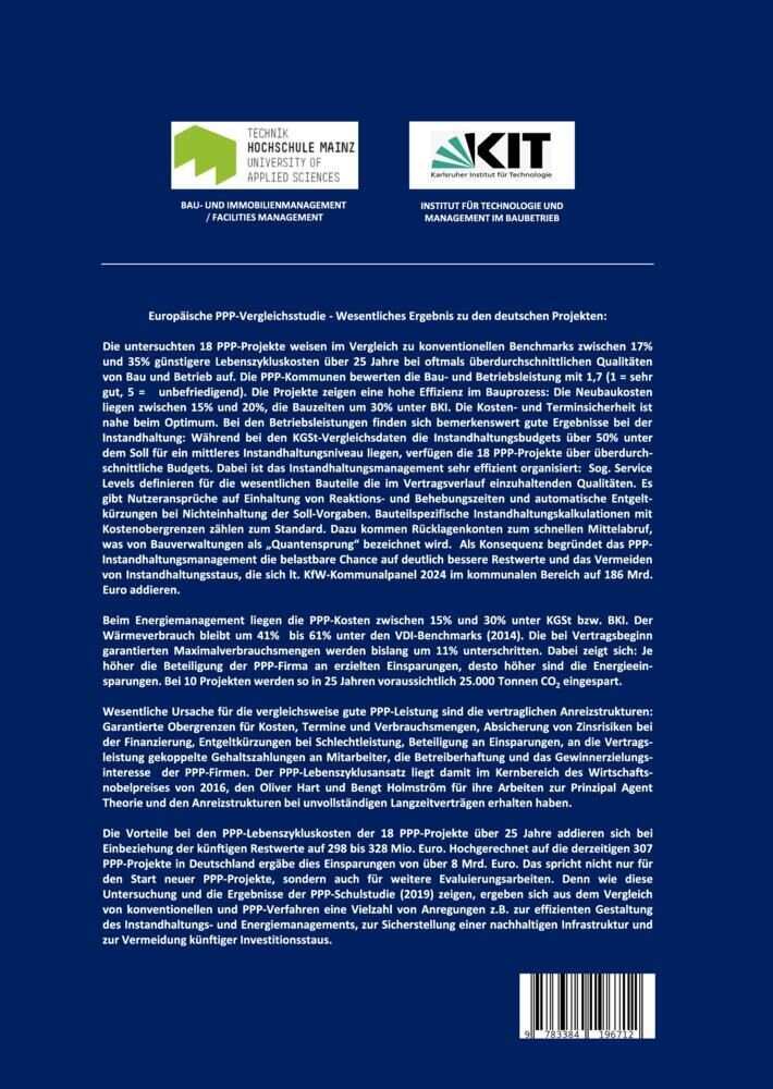 Die untersuchten 18 PPP-Projekte weisen im Vergleich zu konventionellen Benchmarks zwischen 17% und 35% günstigere Lebenszykluskosten über 25 Jahre bei oftmals überdurchschnittlichen Qualitäten von Bau und Betrieb auf. Die PPP-Kommunen bewerten die Bau- und Be...