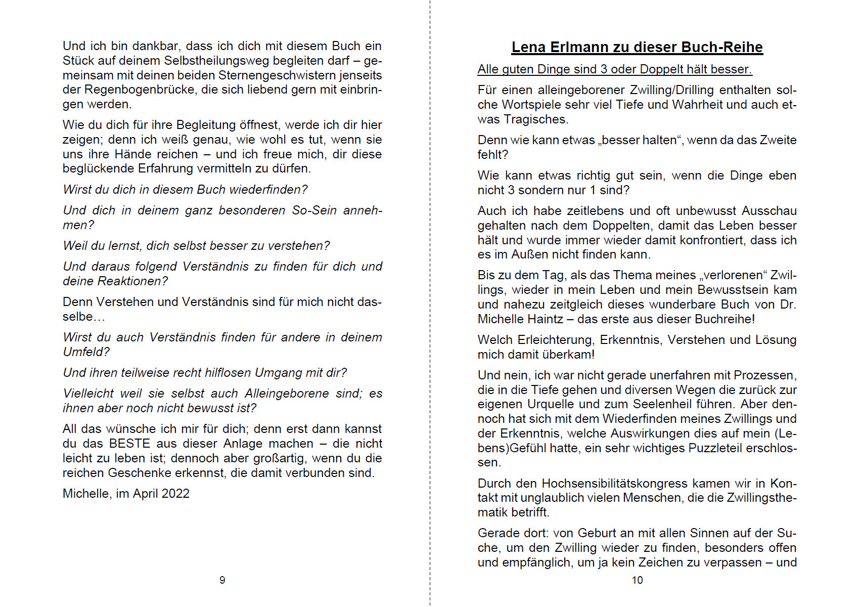 Autorin: Dr. Michelle HAINTZ Als ursprünglich ausgebildete Ärztin ist die Autorin heute vorwiegend als Schriftstellerin und bildende Künstlerin tätig: sie schreibt Romane, Sachbücher und Gedichte. Darüber hinaus kreiert sie Reliefbilder und Wandobjekte in der neu von ihr entwickelten Laminage-Technik. In ihrer Tätigkeit als Persönlichkeits-Trainerin (in Seminaren und in der Einzelberatung) liegt ihr Schwerpunkt in der freudigen und lustvollen Entfaltung des in uns allen angelegten menschlichen Potenzials auf allen Ebenen unseres Seins! Wichtigstes Credo ist ihr: Wir brauchen nicht über uns selbst hinaus zu wachsen, wir sind groß genug, wenn wir damit aufhören, uns selbst kleiner zu machen, als wir sind; aber auch Anderen nicht mehr erlauben, uns klein zu machen! Es gilt also letztlich, in uns selbst hinein zu wachsen und unsere wahre Größe einzunehmen! Schwerpunktthema ist die Begleitung alleingeborener Zwillinge (und Drillinge) sowie Hochsensibler und Hochsensitiver auf ihrem Weg in die Bewusstwerdung und Heilung ihres Verlust-Traumas. www.michellehaintz.at