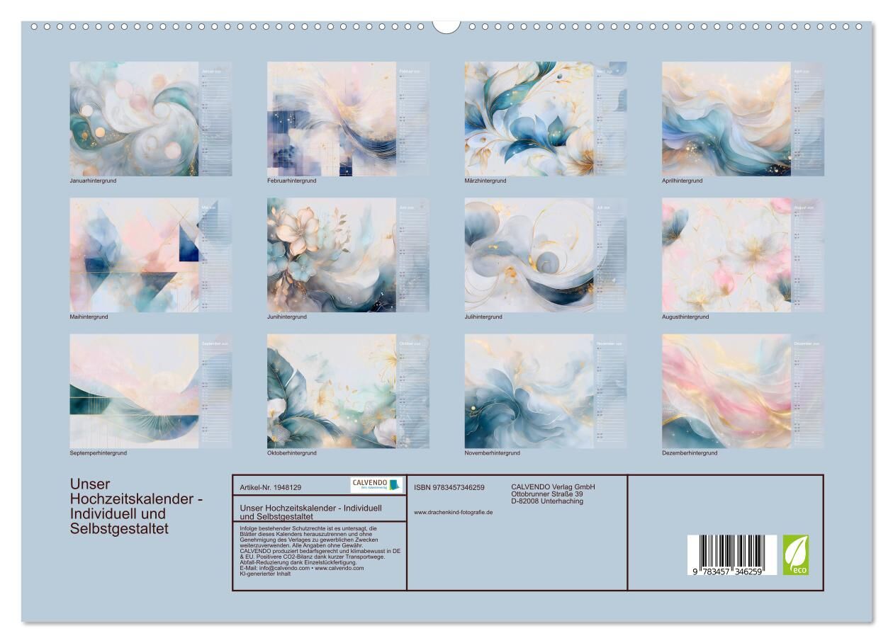 Dieser neue Hochzeitskalender mit eleganten, KI-generierten Hintergründen zum Selbstgestalten bietet Paaren oder ihren Freunden, die Möglichkeit, die schönsten Momente stilvoll zu präsentieren. Jeder Monat wird durch kunstvoll gestaltete Hintergründe hervorgeh...
