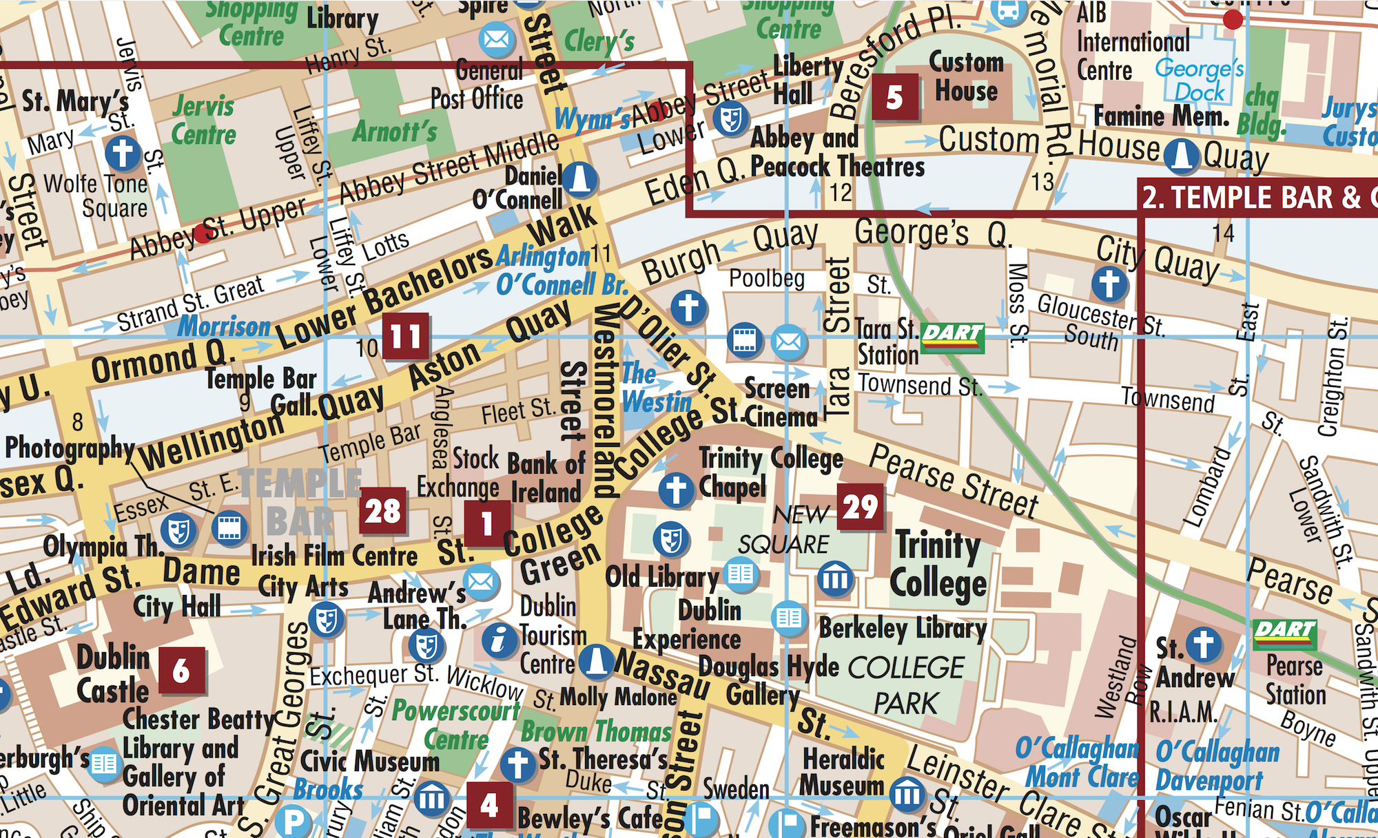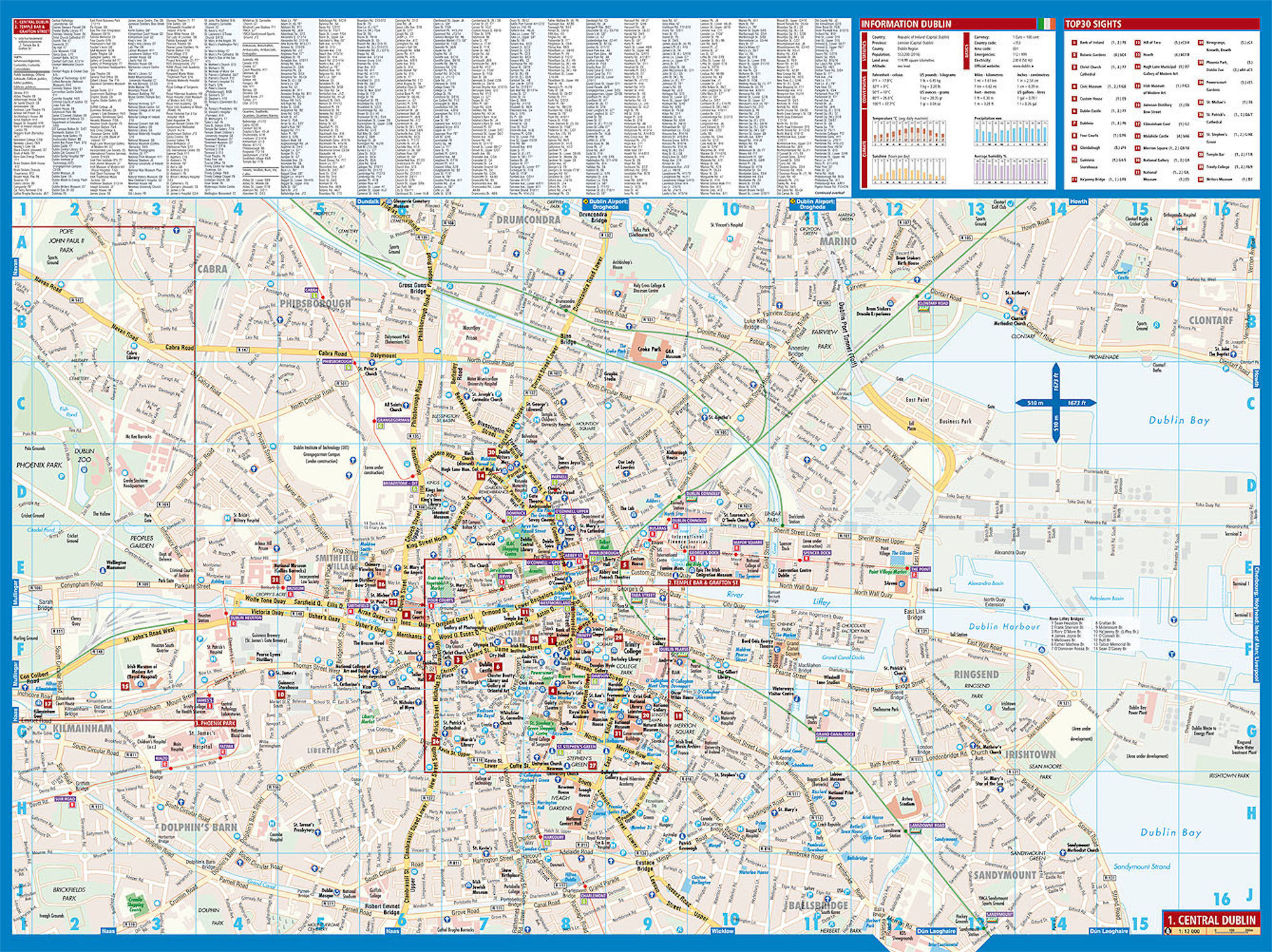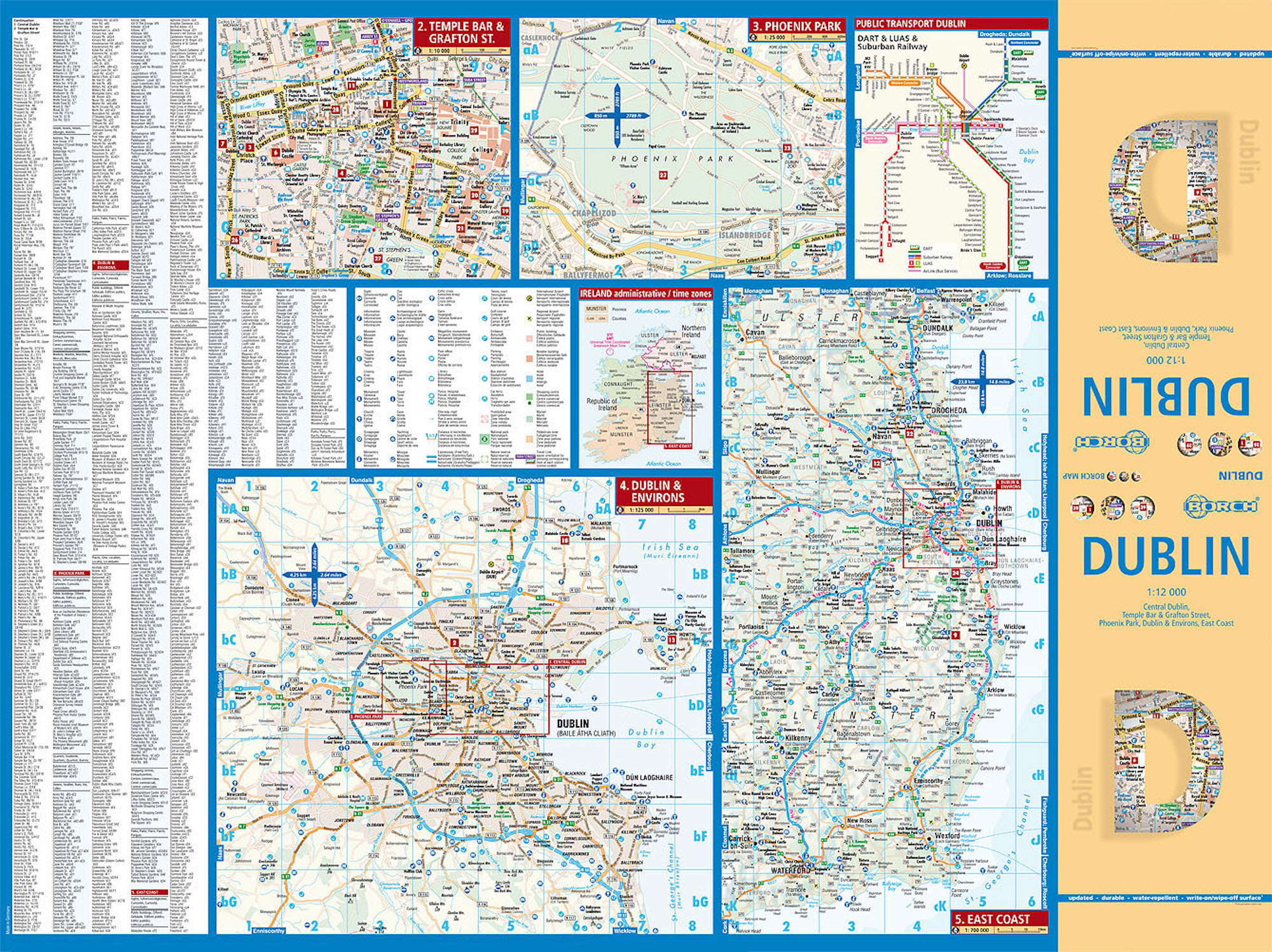 Our laminated and folded Borch Map of Dublin in the 10th edition contains: Central Dublin 1:12 000, Phoenix Park 1:25 000, Temple Bar & Grafton Street 1:10 000, Dublin & Environs 1:125 000, East Coast 1:700 000, the public transport system and an admin...