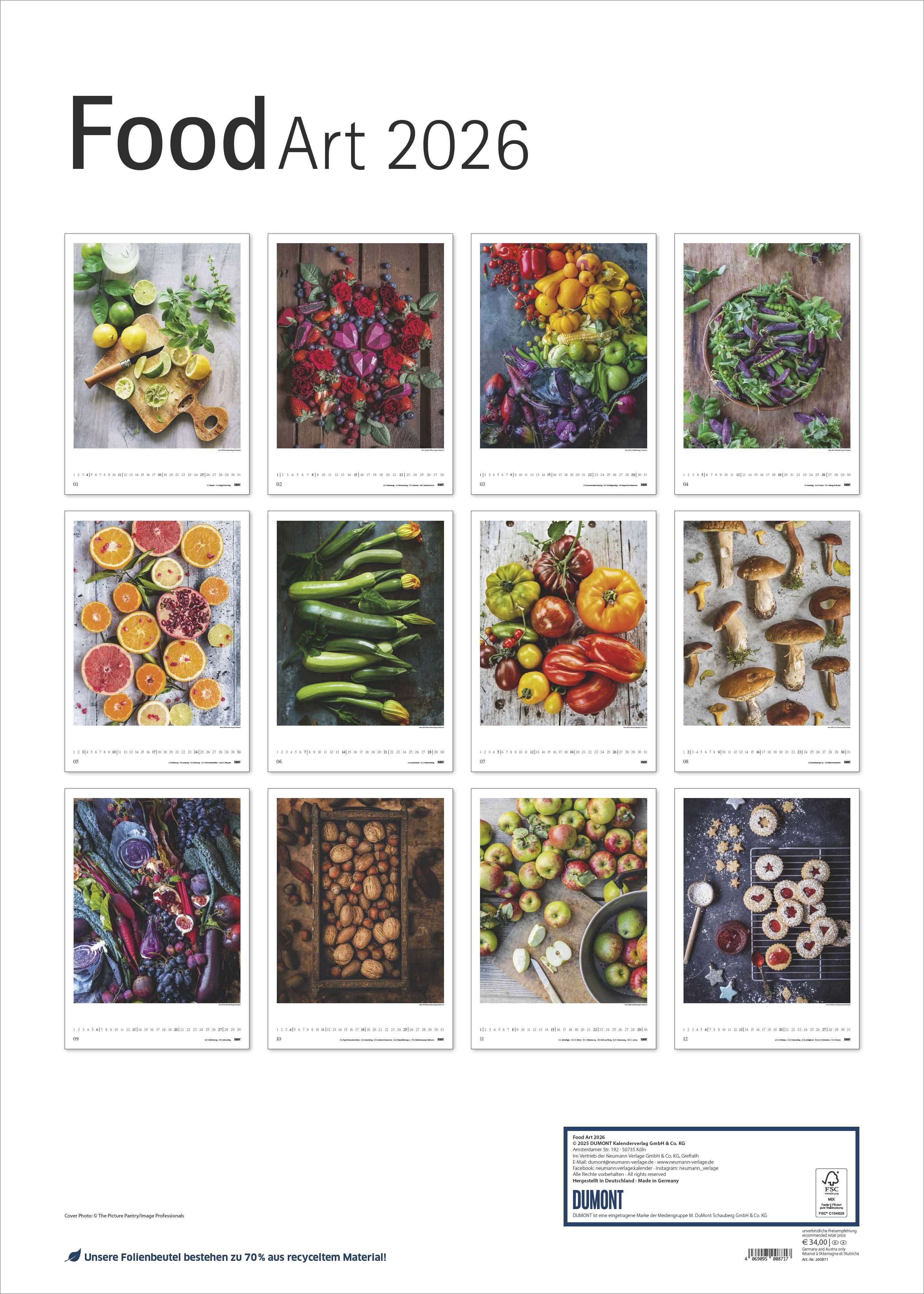 Der DUMONT Wandkalender 2026 Food Art verbindet Kulinarik mit Kunst und macht jedes Monatsblatt zu einem visuellen Highlight. Mit 12 kunstvoll arrangierten Food-Motiven zeigt er die kreative Vielfalt von Lebensmitteln ein echter Blickfang für Küche, Esszimmer...